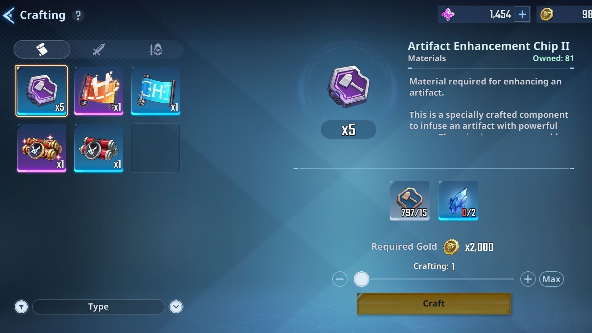 Crafting is the last source of Artifact Enhancement Chips in Solo Leveling Arise, as of writing. You can only craft tier II chips, which requires 15 tier I chips, two Advanced Mana Power Crystals, and 2,000 Gold for one unit. You can also get Hunter Exclusive Weapons of SSR rarity and Skill Scrolls by crafting.