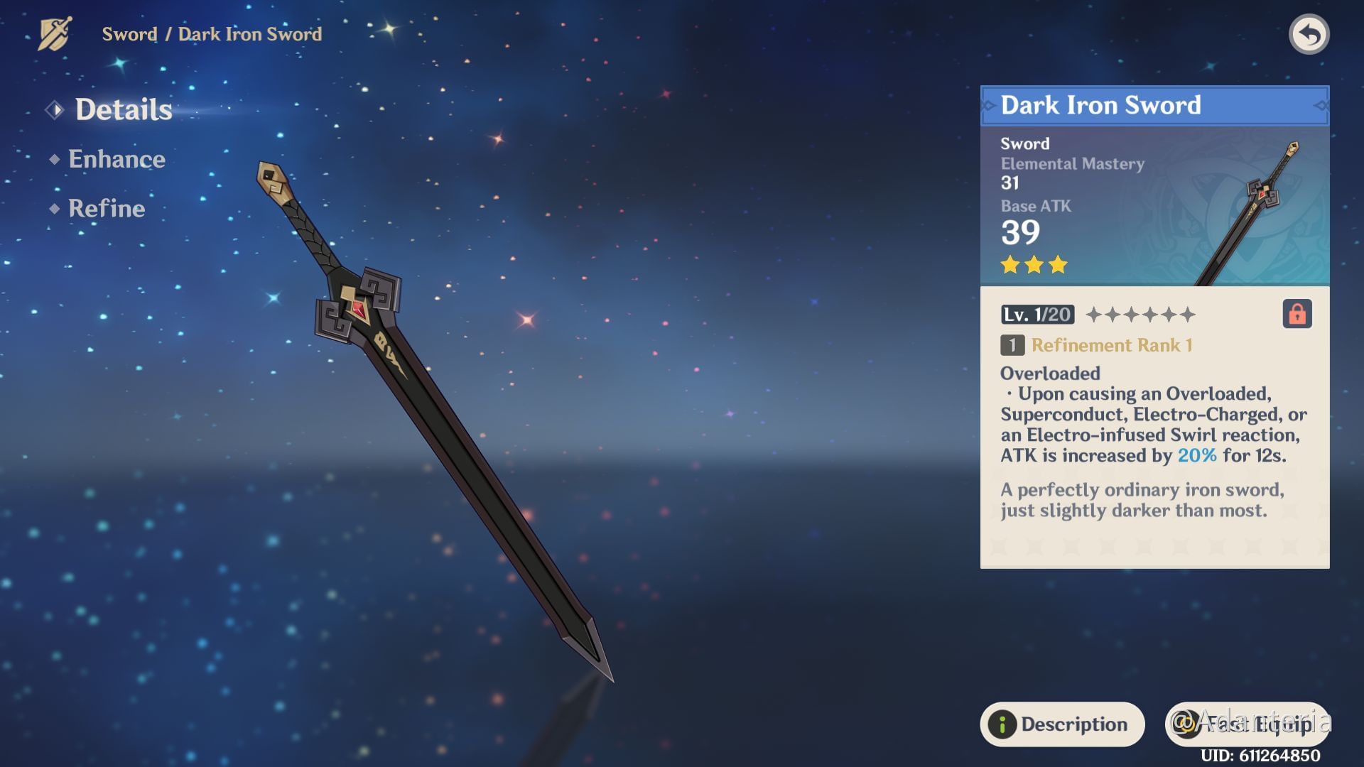 Early-game players who do not have access to the aforementioned 5-star and 4-star swords can opt for the 3-star weapon, Dark Iron Sword. It offers Elemental Mastery via its secondary stat and can increase Kazuha's attack after triggering the swirl reaction.