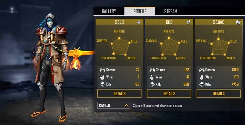 The streamer has three Booyahs in 27 ranked solo matches and has, in the process, killed 128 enemies at a K/D ratio of 5.33.