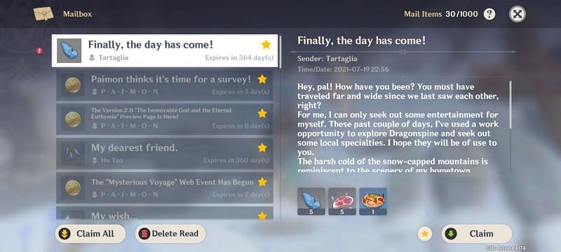 On Tartaglia’s birthday, the harbinger’s message comes with a few rewards packaged inside. Players should simply open the mail and click “Claim” in the bottom-right of the screen to get the rewards.