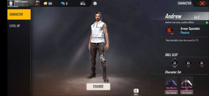 The character can be leveled up using character fragments. At his highest potential, his vest durability loss is decreased by 12%.