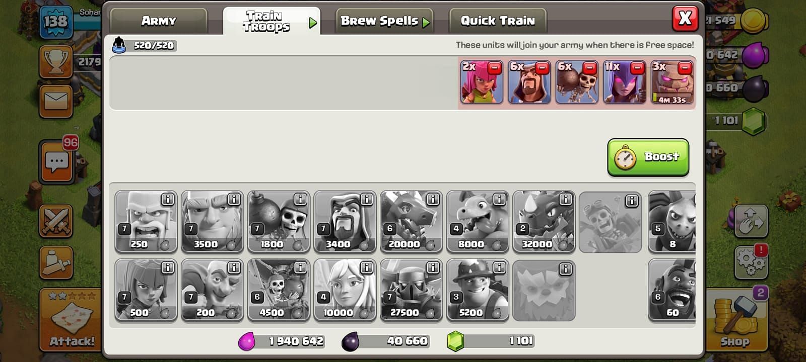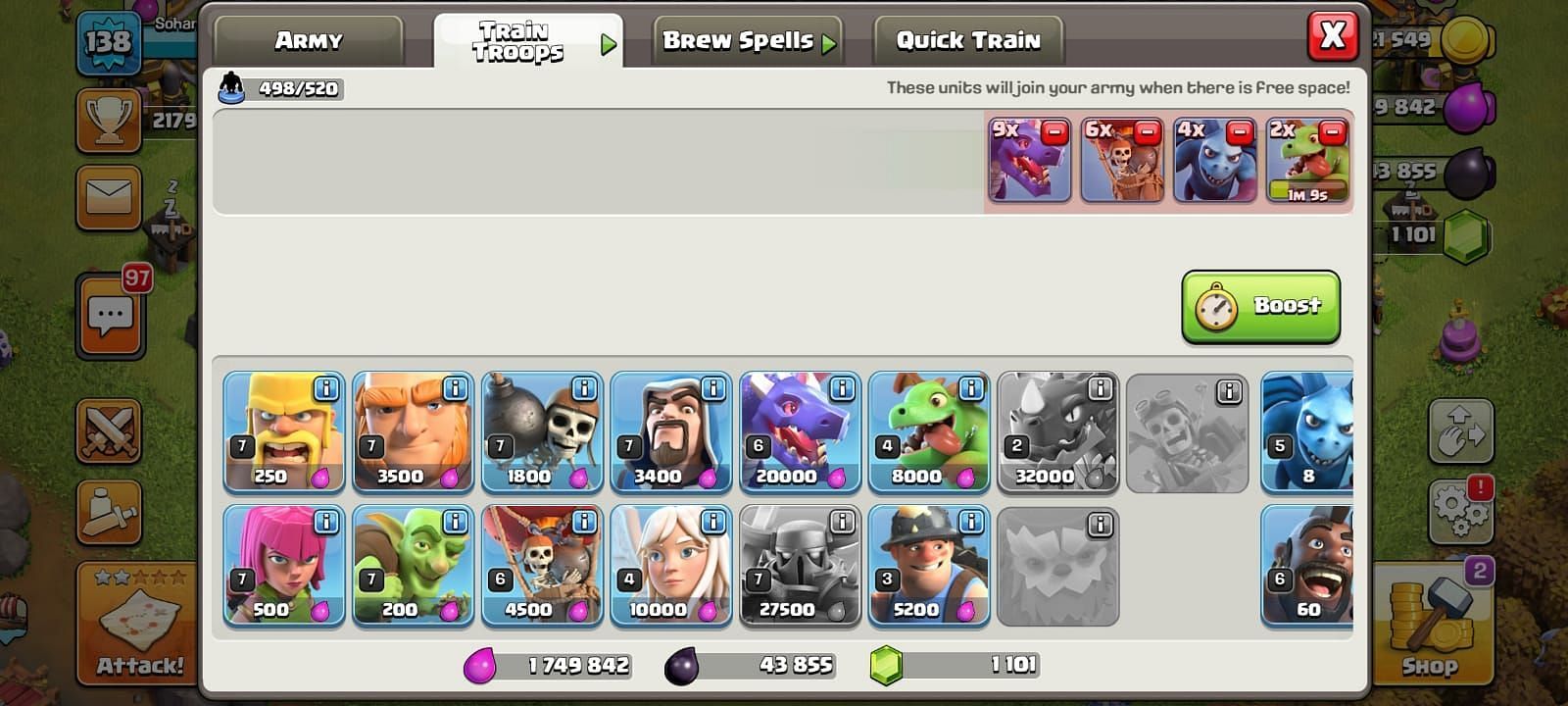 Clan Castle - 3 Rage Spells, 1 Jump Spell,1 Freeze Spell and 2 Haste Spells.