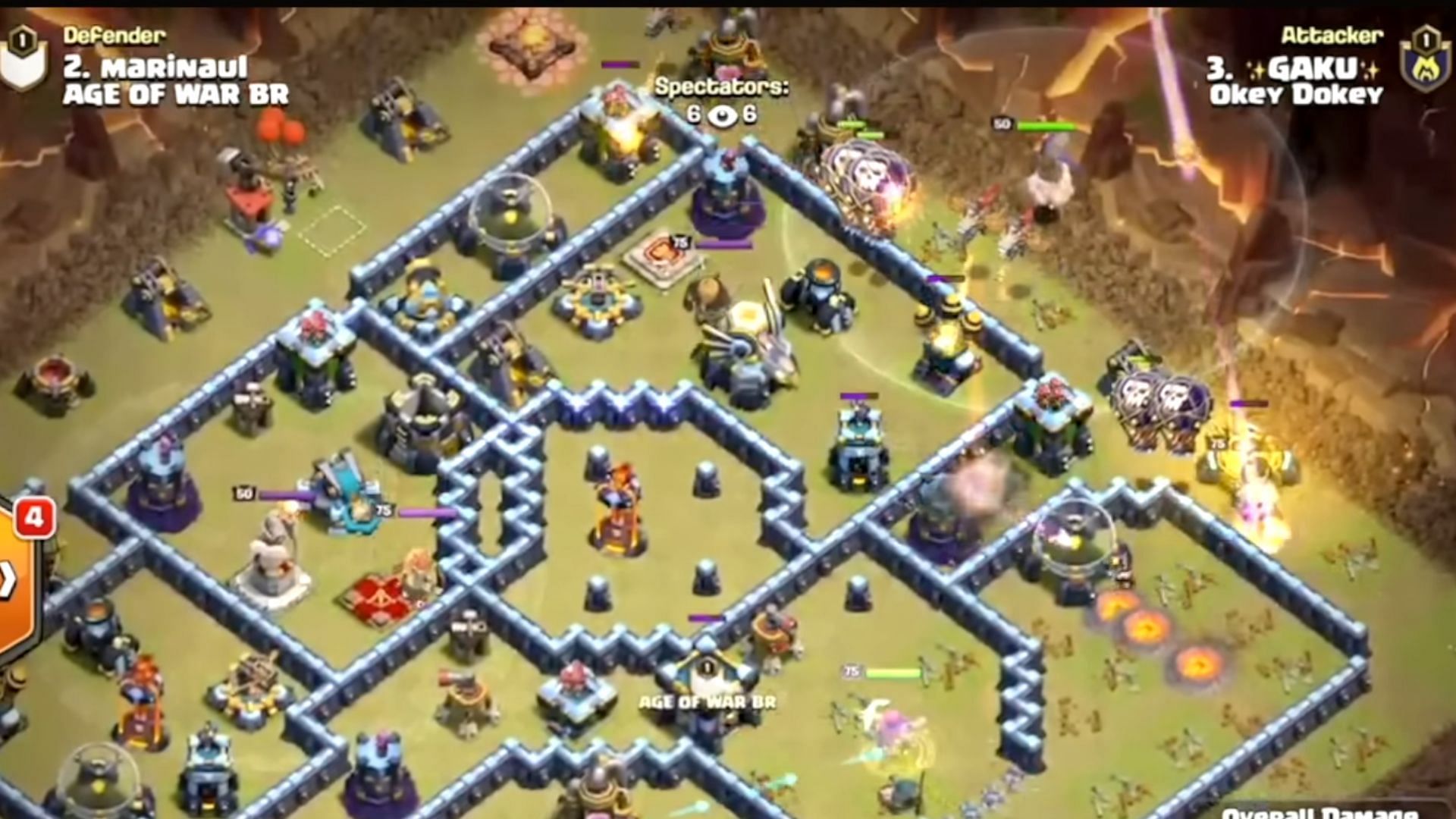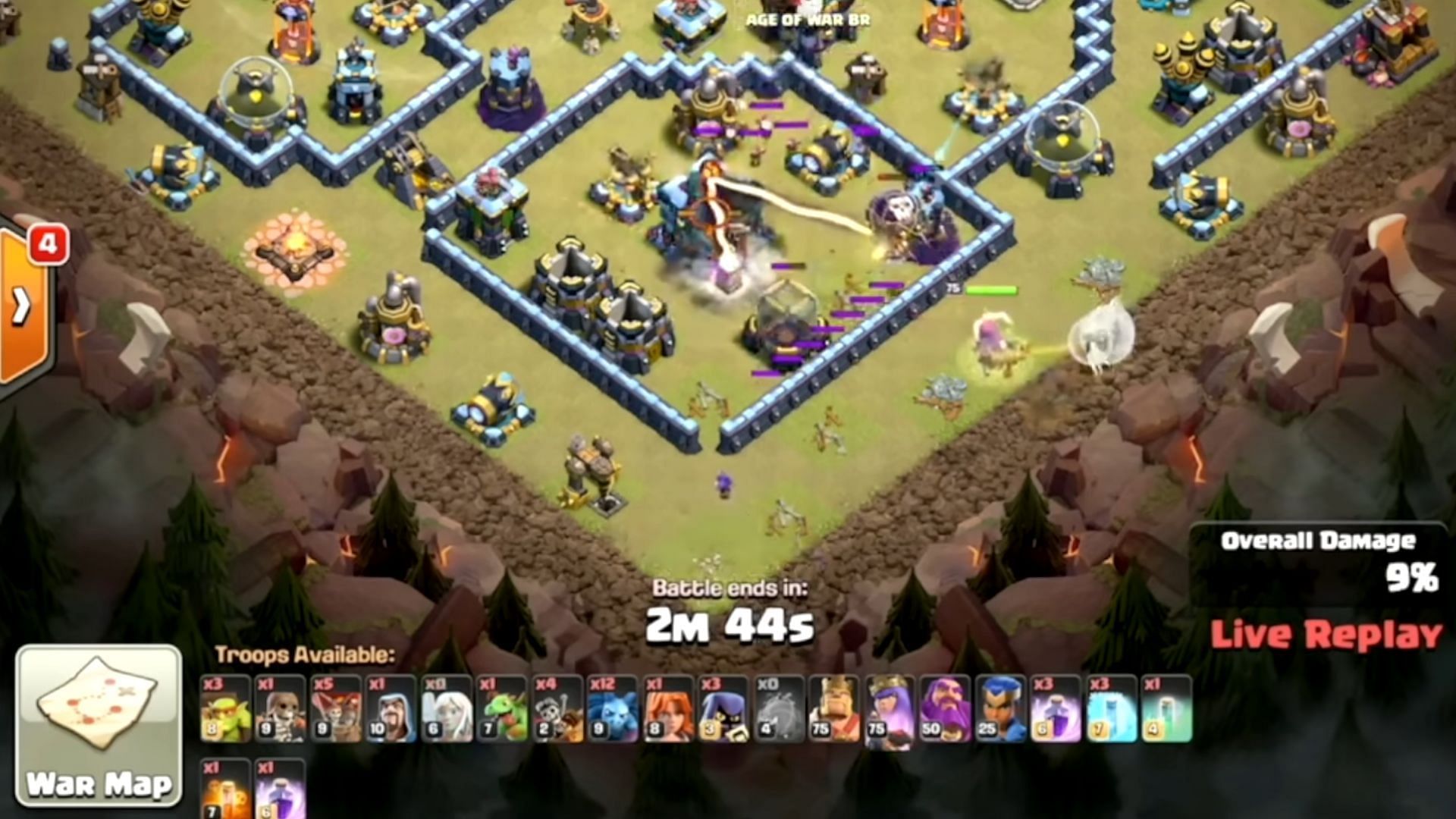 Barbarian King is employed from the other corner of the attacking side to eliminate outside buildings and create a funnel for troops to enter the base core. Super Wall Breakers are used to build multiple wall openings in the base. Once the funnel is created, Dragon Riders, Minions, Grand Warden, Royal Champion, and Balloons are used to clear the core.
