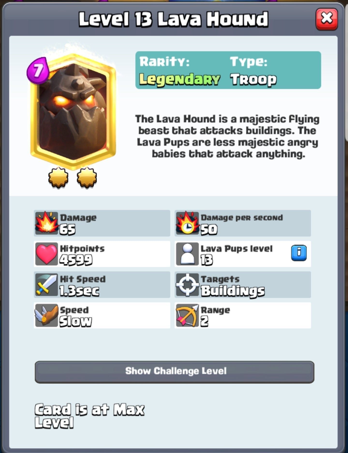 It costs 7 Elixir to play a Lava Hound card, which has 3150 hitpoints and 34 damage per second at the base level. The card has 14 levels at the moment, with room for more in upcoming updates!
