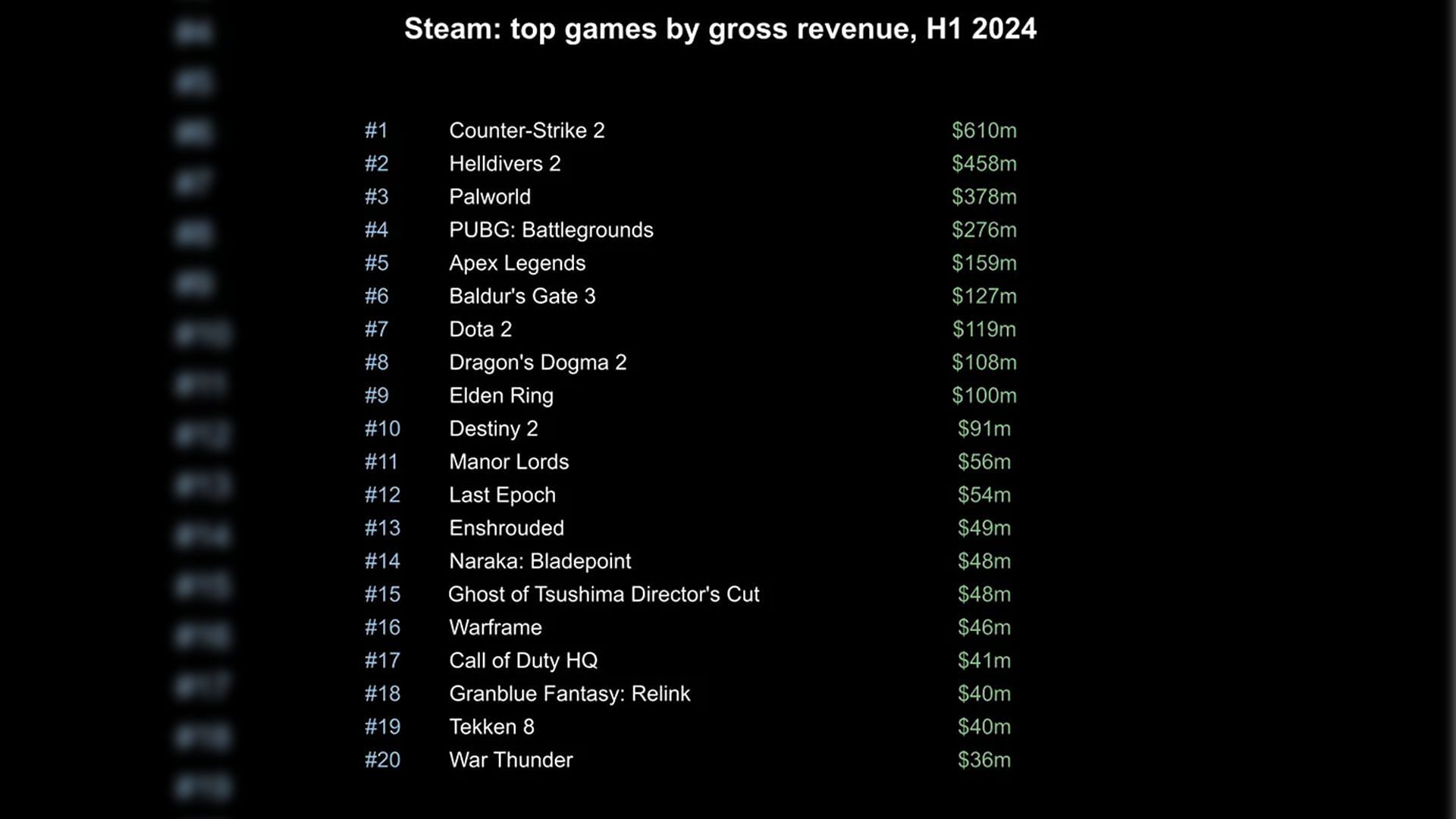 Counter-Strike 2 (CS2) has reportedly made over $610 million in profits in the first half of 2024. The founder of @gamediscoverco, @simoncarless, shared a post on X with a screenshot showcasing a list of games alongside the lucrative incomes for the Top 20 Steam titles. The calculations and statistics were made and provided by Gamalytic as a result of direct collaboration.