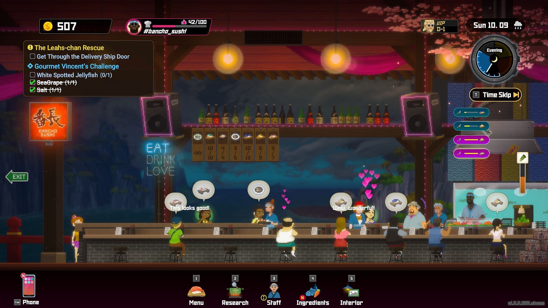 You need to select the menu that you will be serving that evening. This is based on whatever you have caught during the day and the ingredients that are available from there. You can upgrade dishes using resources too. Thankfully, you can swap a dish on the menu for another while service is on if you run out of ingredients.