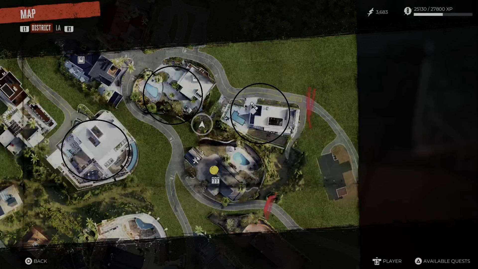 The top circle, closest to the player icon above (the house with the safe icon) has a clue. Deal with the zombies you find there. The next clue (Note for Michael) for Lost and Found: The Clean and Snatch for Dead Island 2 is in the pool at the house to the east. You’ll see the white glow of the object.