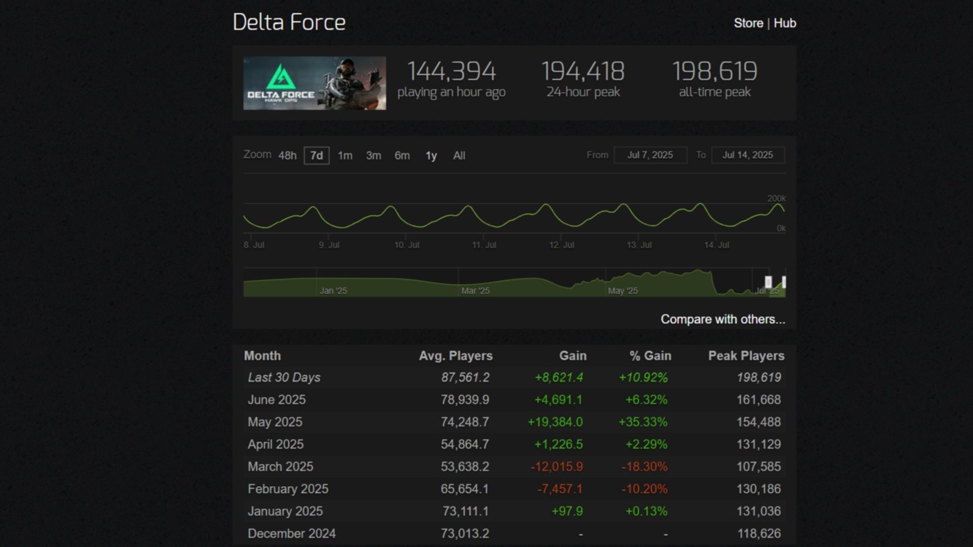 Delta Force has once again broken its all-time peak player count on Steam. Since its release in December 2024, the free-to-play FPS has steadily grown its player base. Featuring a variety of gameplay modes, from large-scale PvP warfare and challenging extraction shooter experiences to the iconic Black Hawk Down campaign that can be played solo or with friends, Delta Force continues to appeal to a broad audience.