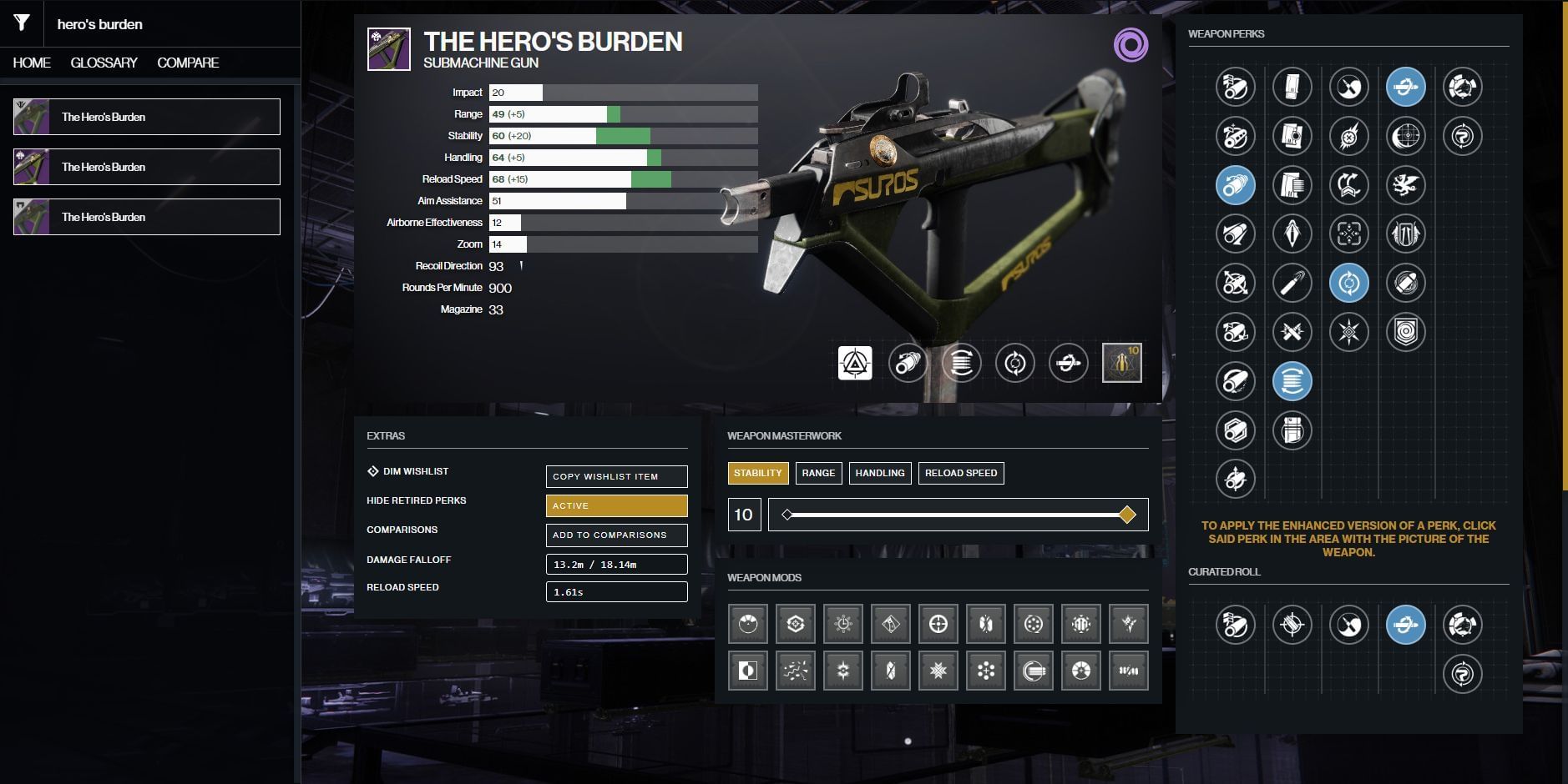 Perk combinations on The Hero's Burden can either go wrong or make the weapon extremely potent against other Guardians. From tweaking Stability to Range and even damage bonus perks, there are a lot of options for this Void Submachine Gun inside PvP.