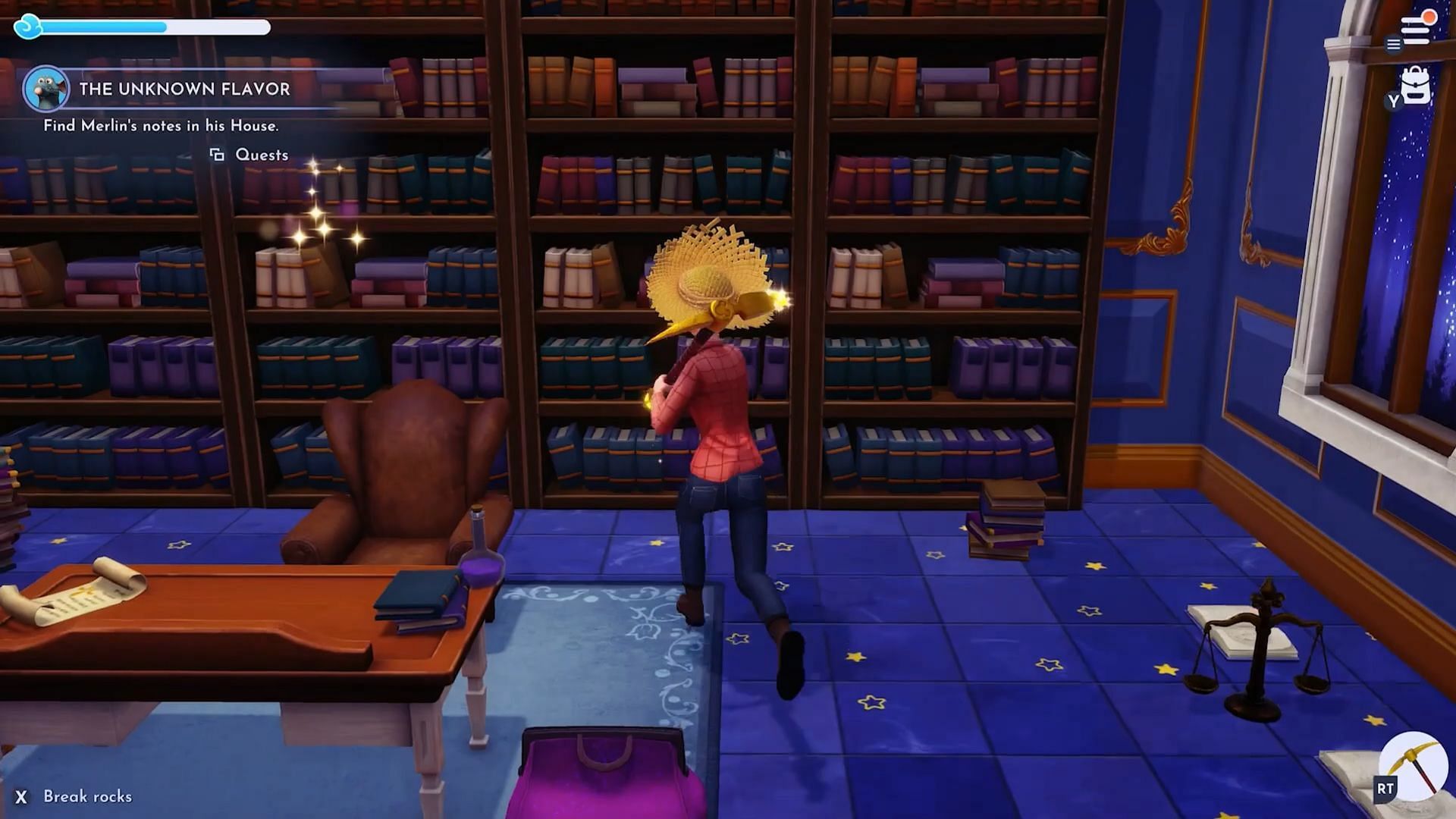 Step 2: Head over to Merlin’s house, and you’ll see a sparkling item on his bookshelf. Pick up the item, and the game will tell you to gather three purified Night Shards for the recipe.