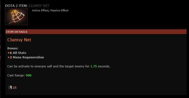 Clumsy Net has both active and passive abilities. The item provides +6 All Stats(+6 Strength, +6 Agility, +6 Intelligence) and +2 mana regeneration which are great passive bonuses to have at the 15-25 minute mark. The net roots enemy heroes upon casting. One major drawback of the item is that it also roots the caster along with the enemy.