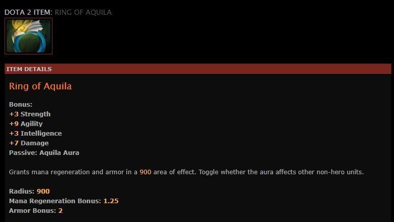 Like most removed items which found their way back in the game, Ring of Aquila made its return too. The item provides 1.25 mana regeneration and 2 armor to nearby allies with its aura. Also gives +3 Strength, +9 Agility, +3 Intelligence and +7 Attack damage to the item carrier.