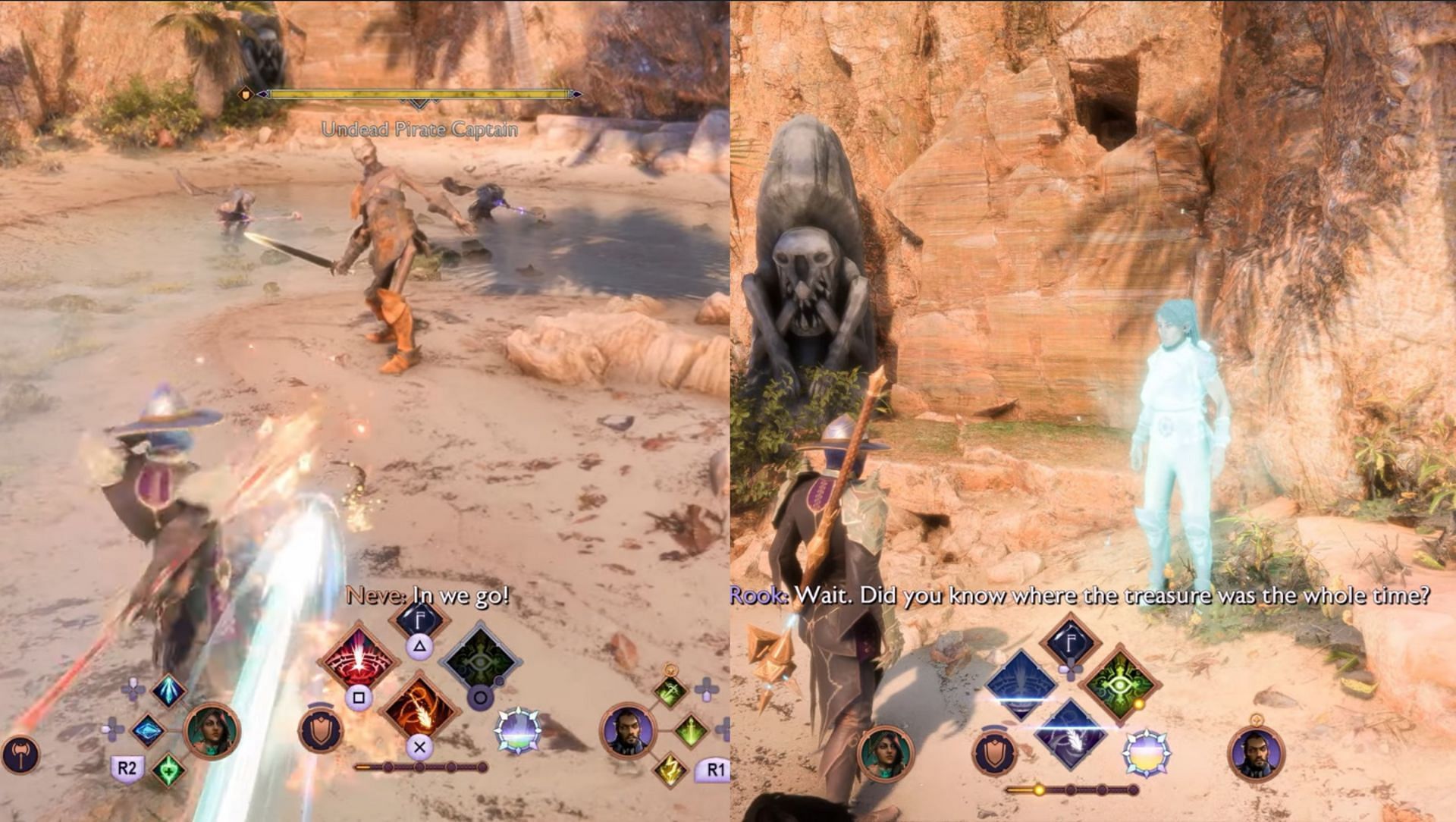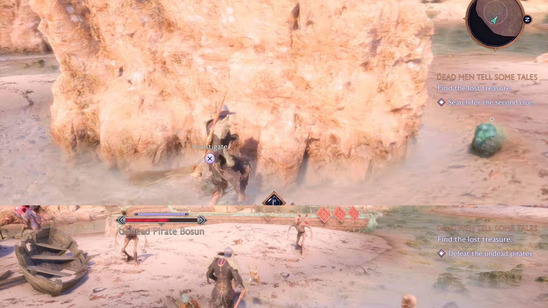 The first clue she provides takes the party to the beach-like area near the ruins, where a large skeleton and some destroyed boats are visible. Here, a horde of undead pirates appear and attack the party. Each enemy here and in the succeeding areas is weak to Necrotic damage. Defeat them, and head toward the large rock near the tail end of the skeleton.