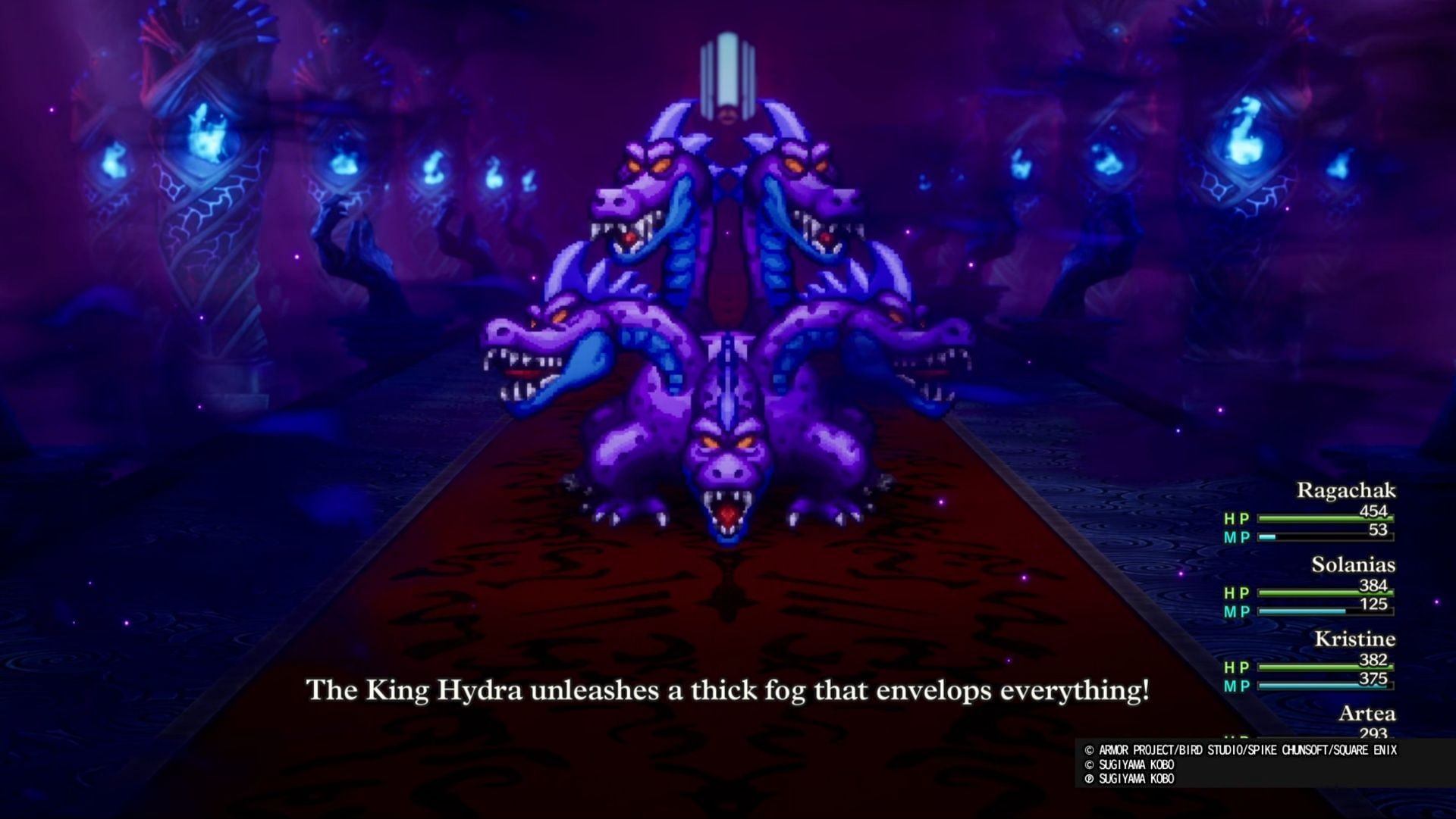 When the King Hydra is at about half health or so in Dragon Quest 3 HD-2D Remake, it will shroud the map in a black fog. While this prevents both parties from casting spells, it obviously hurts your party much more. You should have two Sage's Stones by now for healing, so make use of them.
