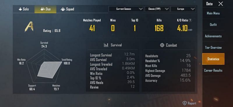 Dwoz has played 41 duo games too, but failed to win in any of them. Nevertheless, he still has a fantastic K/D ratio of 4.10 with 168 kills.