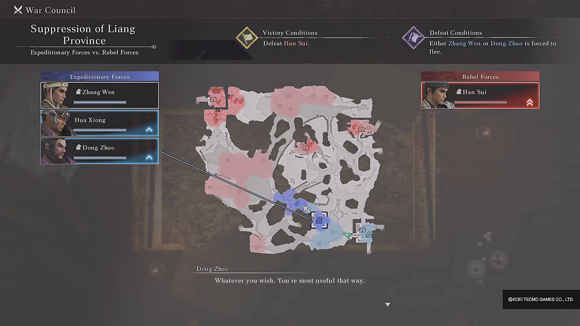 The mission begins with the enemy officer Bian Zhang in the northern camp. Target him first, as the allied forces led by Zhang Wen, Hua Xiong, and Dong Zhuo will advance southward to attack other rebel camps.