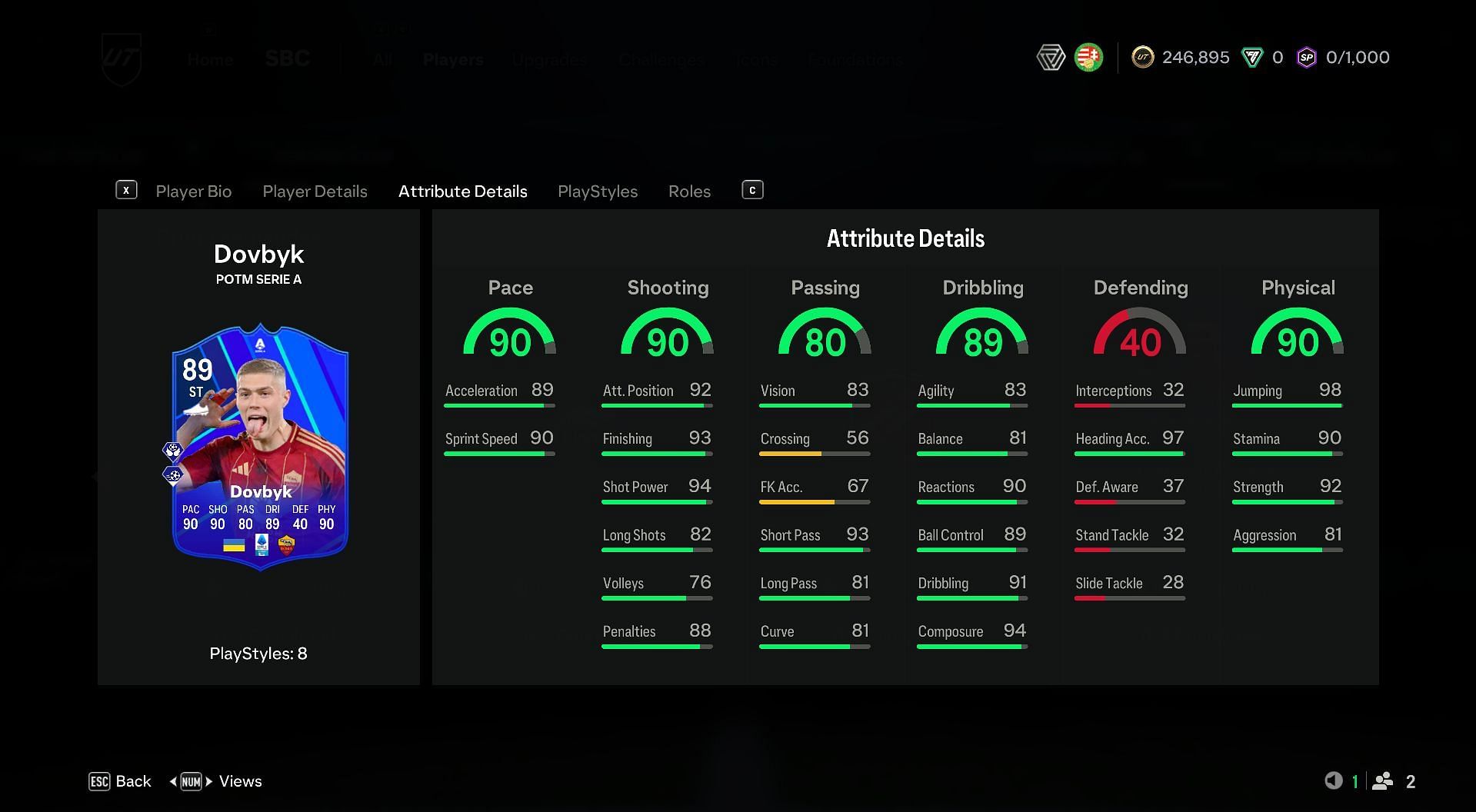 The EA FC 25 Artem Dovbyk POTM SBC item features a few exceptional attributes, such as 90 Pace and Shooting, 89 Dribbling, and 90 Physicality. Additionally, the card possesses Low-Driven Shot+ and Aerial+ PlayStyle traits. While the former might seem the more beneficial of the two due to the item's 93 Finishing stat, gamers can also exploit the Aerial+ trait with POTM Dovbyk's 97 Heading Accuracy.