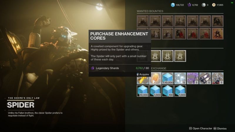 Spider, the planetary vendor on Tangled Shore, also exchanges planetary materials, glimmers, and legendary shards for a price of additional glimmers or a sum of legendary shards.
