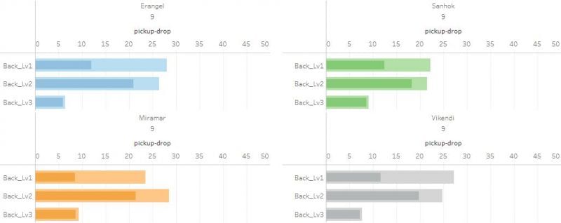 <Indicator on backpacks acquired in the first circle per map, 12/24/2018 ~ 01/05/2019, Bold bar in Graph: Item Drop Rate / Light bar: Item Pick-up Rate>