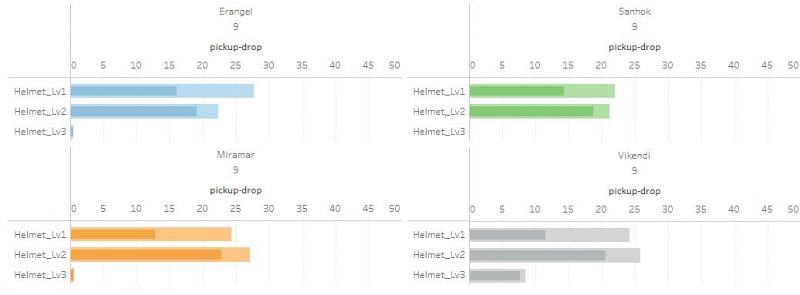 <Indicator on helmets acquired in the first circle per map, 12/24/2018 ~ 01/05/2019, Bold bar in Graph: Item Drop Rate / Light bar: Item Pick-up Rate>