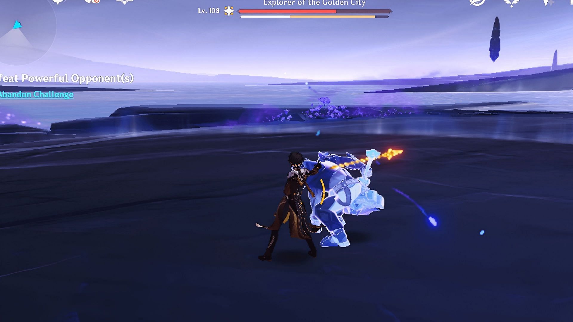 Occasionally, the Explorer of the Golden City will gain a shield while in combat. Its shield, much like the enemy itself, is resistant to damage from any of your normal skills and abilities. You must repeat the same process of dodging as earlier, to damage its shield. Once the shield is completely depleted, the enemy will become motionless for a brief period of time, and all your team's skills will become effective again. This will be a good opportunity for you to deal extra damage to the enemy with your team rotation before it comes back up again.
