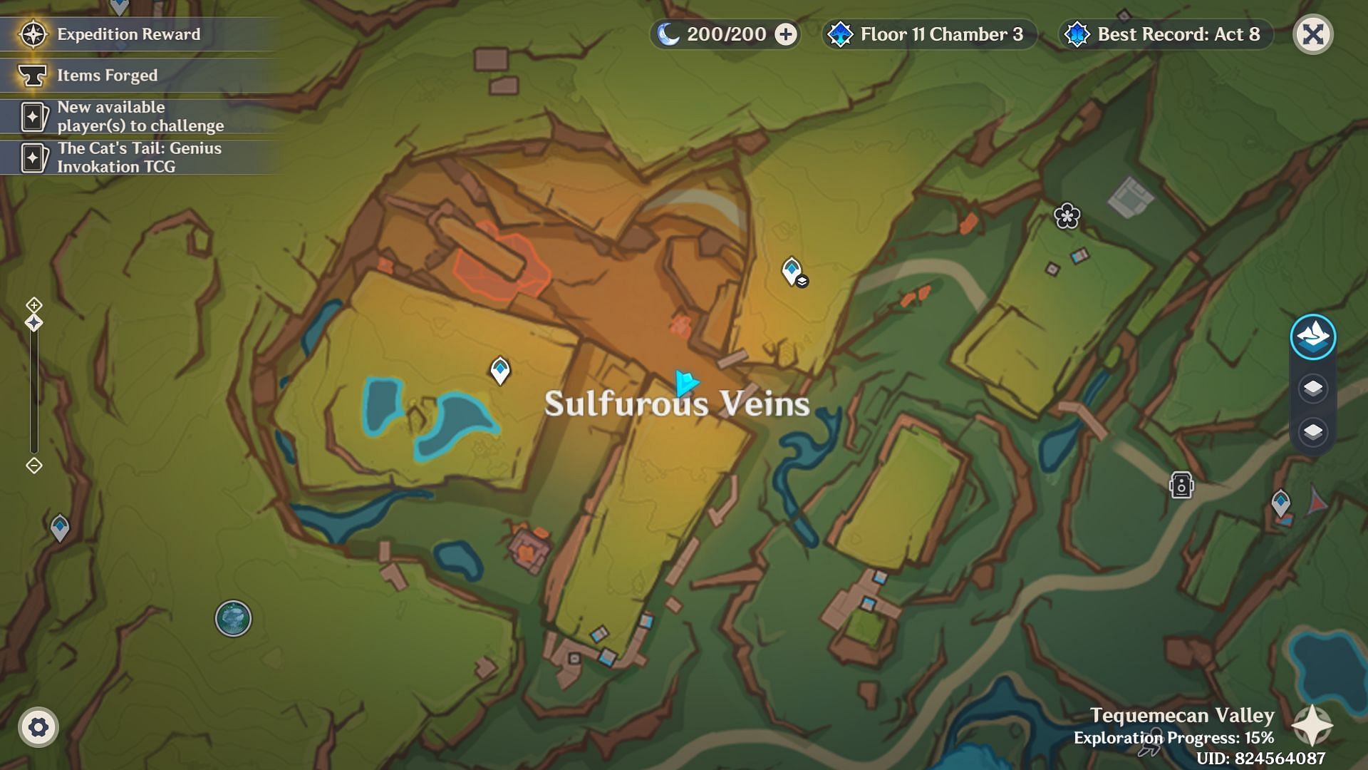 To unlock the Explorer of the Golden City (Tlatzacuilotl) Local Legend, you need to complete a puzzle located in the Sulfurous Veins region of Natlan. Teleport to the waypoint in the exact center of this region and start heading east. Glide down from the cliff into the mines to reach the bottom, and you will find a Tepetlisaurus in a corner, near a glowing cube-shaped rock on the ground, trying to mine. This is the location of the puzzle that you must complete.
