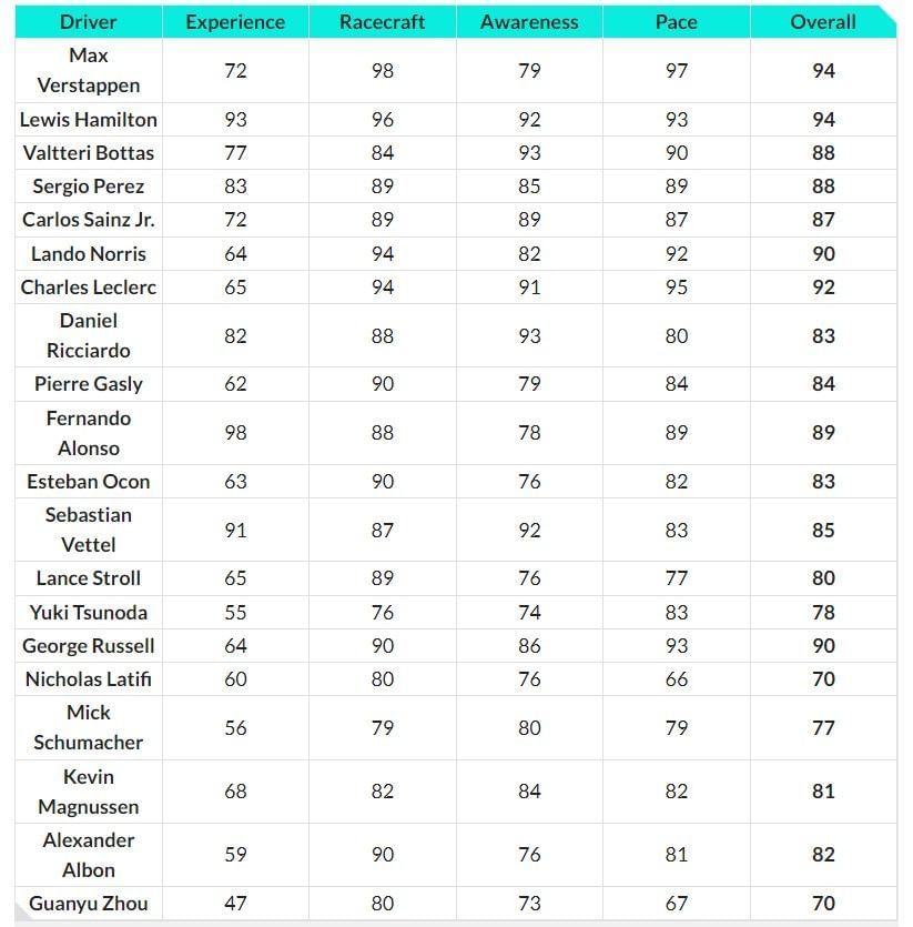 - Racecraft (RAC): This attributes to a driver's ability to finish at a much higher position than where they started the race.