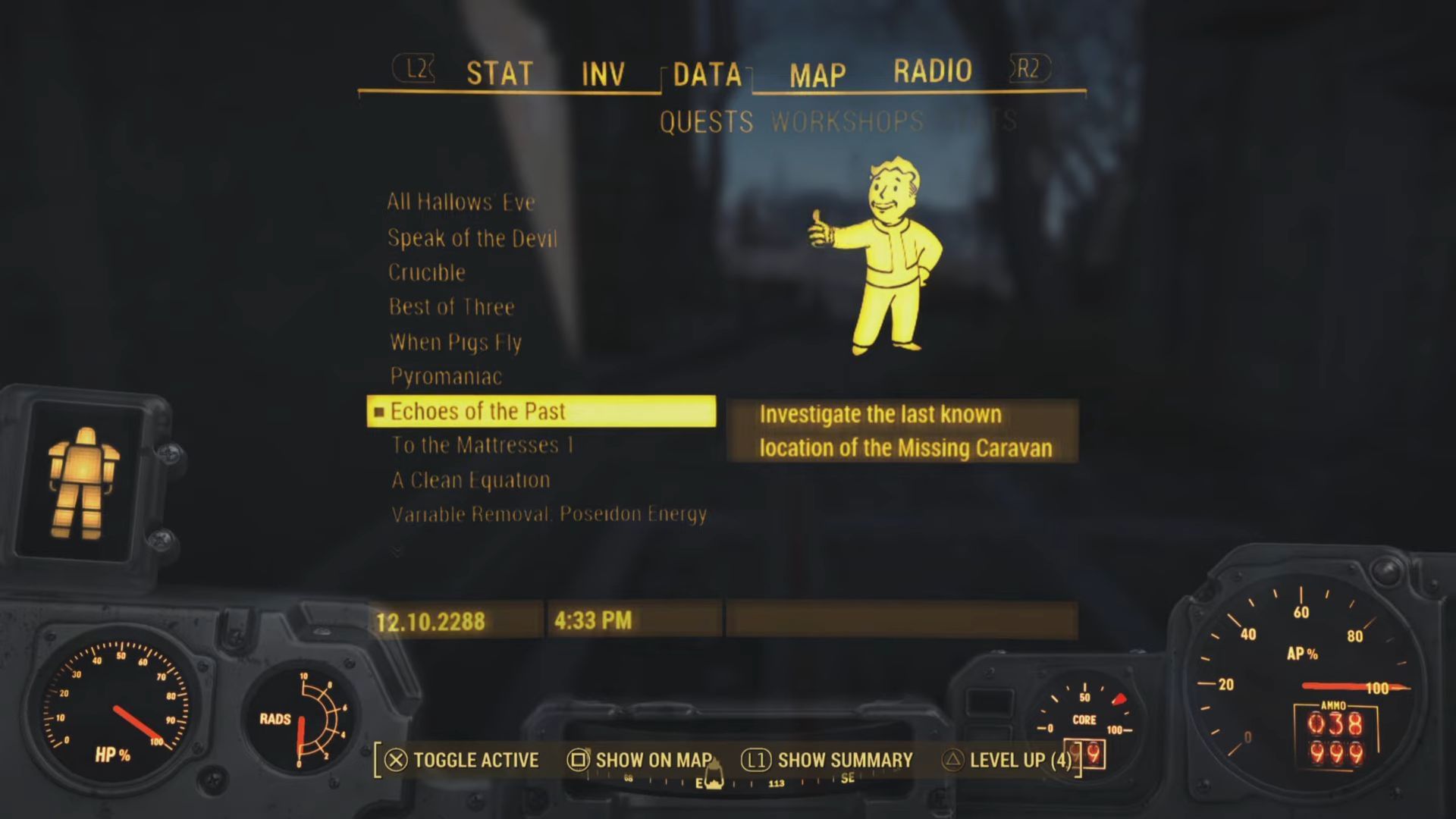 After the Fallout 4 next-gen update, you will see a bunch of messages popping up on the top-left of your screen. You will find the Echoes of the Past mission here. Open your data tab and you shall find the mission and its details over here. The mission marker will be just north of the Saugus Ironworks.