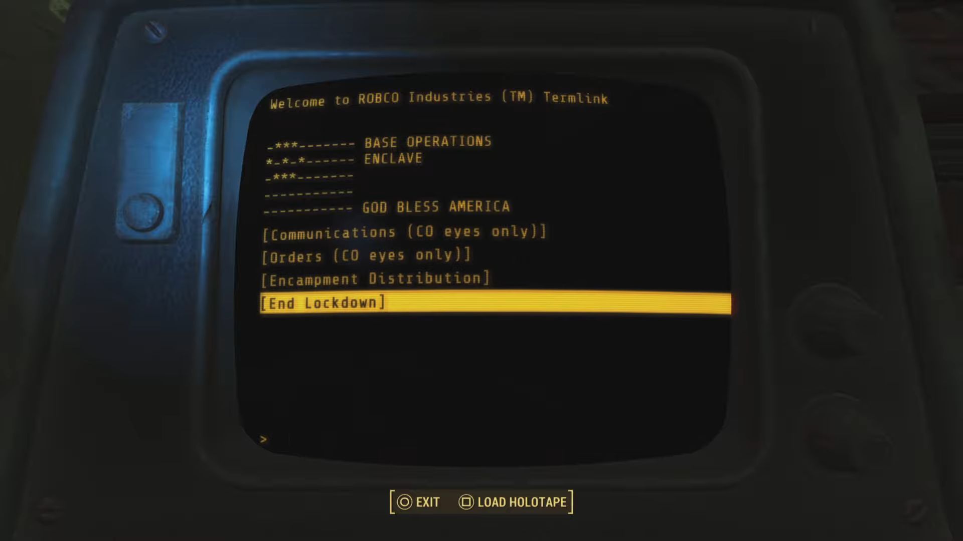 In the room adjacent to where you killed the Enclave Colonel, there is another terminal that you can interact with. This will also be marked by a mission indicator. Head over to the terminal and boot it up. From the menu, select the End Lockdown button.