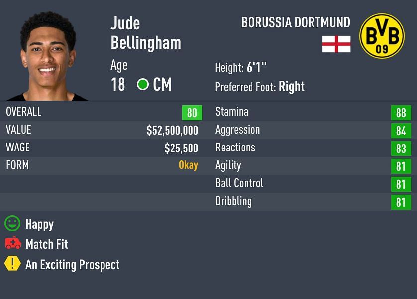 Jude Bellingham is one of Dortmund's young stars who is a regular for the club. Despite his age, Bellingham is aggressive on the field with the ability to create opportunities in midfield. He has a high work rate in both attack and defense and has well-balanced attributes that help nurture his versatility.
