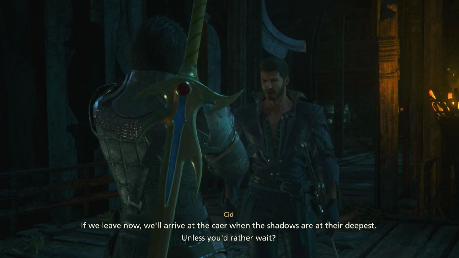 Follow your quest marker to find Quinten. Speaking to him will trigger a cutscene where he and Cid enter a discussion. Despite being allies, Quinten doesn't offer much hospitality during The Dead of Night in Final Fantasy 16.