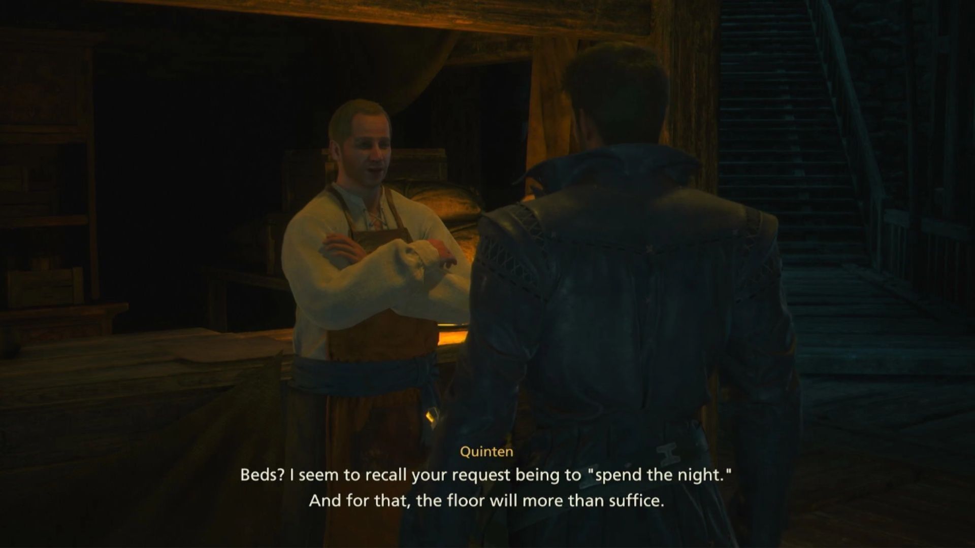 The next portion of Dead of Night in Final Fantasy 16 requires you to speak to Quinten again. Instead of letting the two protagonists sleep in a bed, they slept on the floor. Cid puts a positive enough spin on it, but the two go to rest and watch another cutscene.