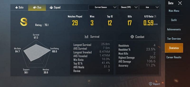 When it comes to the duo mode, Flying Beast has played 29 games and emerged victorious in 3 of them. He has also notched 17 kills with a K/D ratio of 0.59.