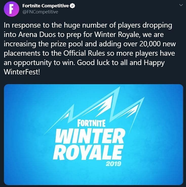 After looking at the large player base that had recently been dropping into the 'Arena Duo' lobby, Epic Games have decided to up the stakes massively. The 'Winter Royale' prize pool to be distributed among all regions was announced to be around $15 million earlier, but is now somewhere in the ballpark of $23 million!