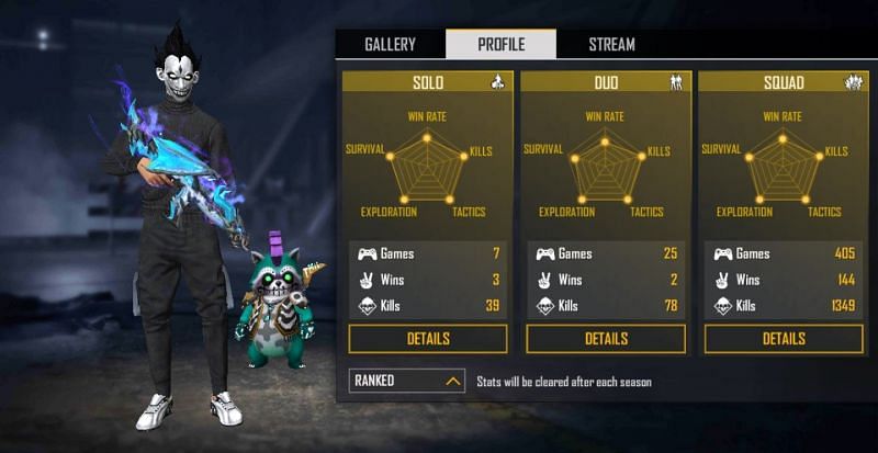 FREE FIRE GAMER’S ZONE has been featured in 405 squad games in the ongoing ranked season and has a win tally of 144, retaining a win ratio of 35.55%. He has racked 1349 kills in the mode with a K/D ratio of 5.17.
