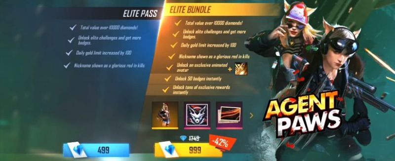 Agent Paws Elite Pass costs 499 Diamonds while the Elite Bundle costs 999 Diamonds. The main difference between the Free Fire Elite Bundle and Elite Pass is that the Elite Bundle unlocks some extra rewards instantly.