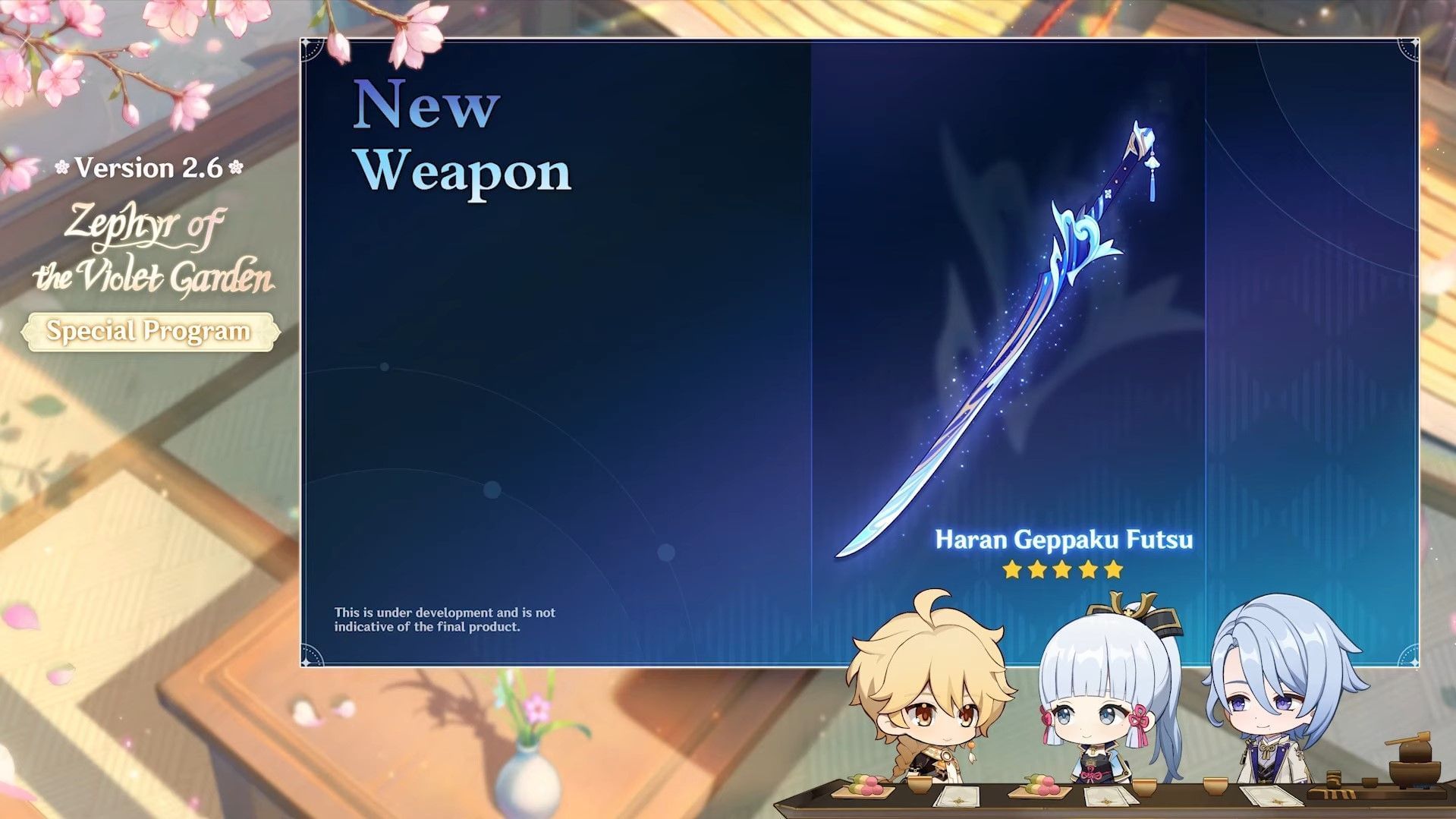 Haran Geppaku Futsu is a brand new 5-star Sword that will make its debut in Genshin Impact 2.6. Although its effect wasn't shown in this Special Program, it has been leaked before. Recent leaks state: