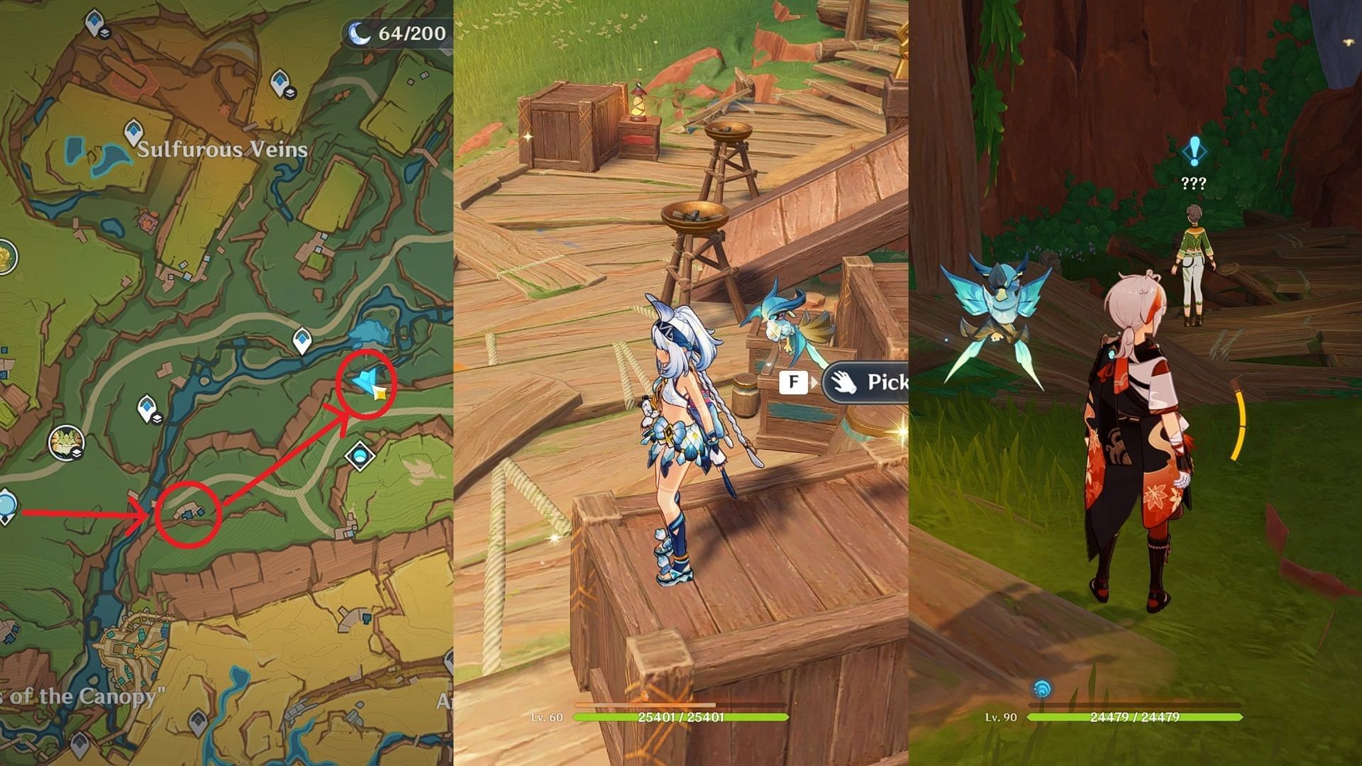 Start by teleporting the Statue of The Seven north "Scions of the Canopy" and head east towards a warrior enemy camp. Defeat the mobs and interact with the wooden box to pick up the Green-Egded Paper Slip. Next, head northeast to find an NPC below the canyon and interact with her to start the Ripe for Trouble quest in Genshin Impact.