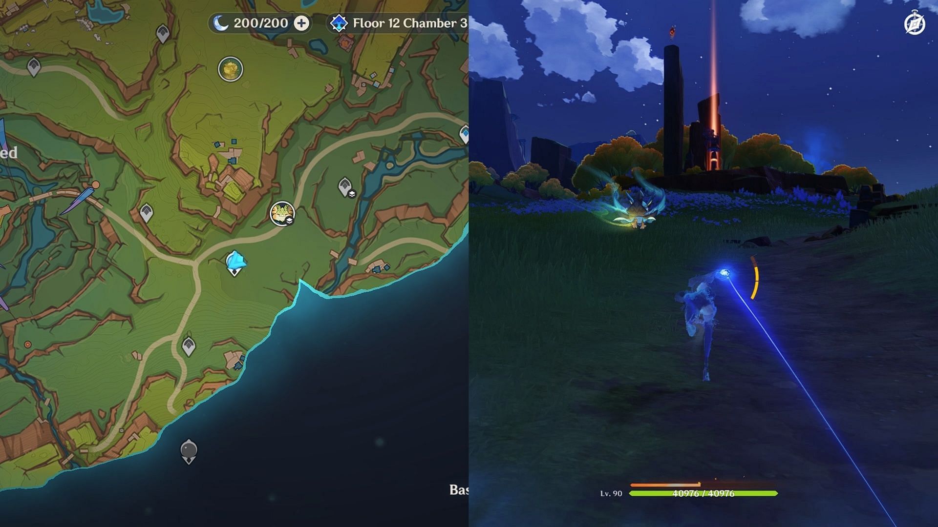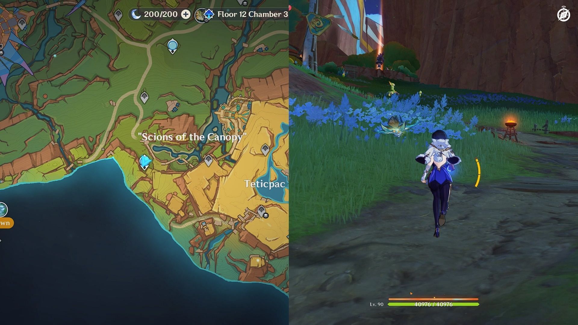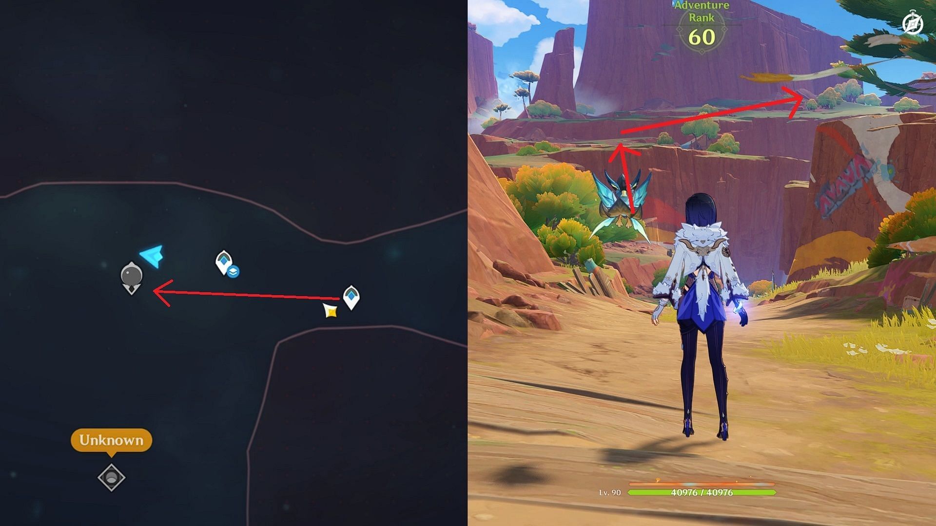 Next, keep moving towards the west until you reach the edge of the canyon to find the first Pyro Statue. Interact with it to light up a bit of the north and the northeast part of the Natlan map.
