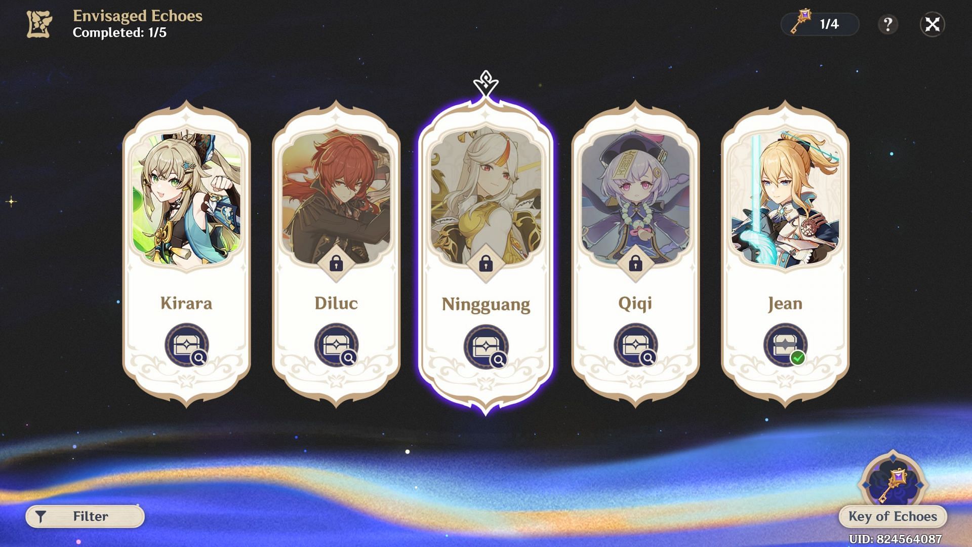 As of version 5.0, there are a total of five Envisaged Echoes available for the existing characters in Genshin Impact. These characters are Kirara, Diluc, Ningguang, Qiqi, and Jean.
