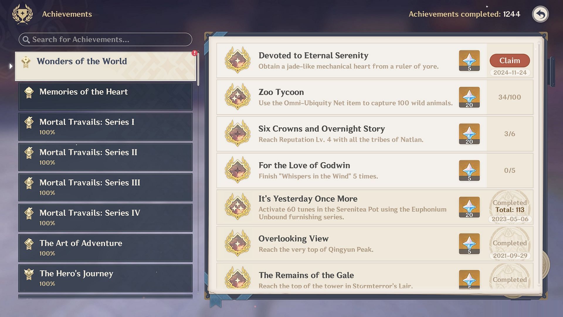 All the new achievements in the Wonders of the World offer five Primogem rewards in Genshin Impact. Some of them can be unlocked during certain world quests. Completing them is highly advisable since doing these quests will also unlock locations that are usually inaccessible.