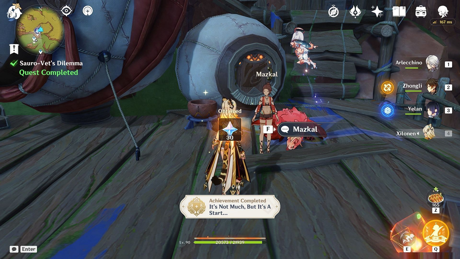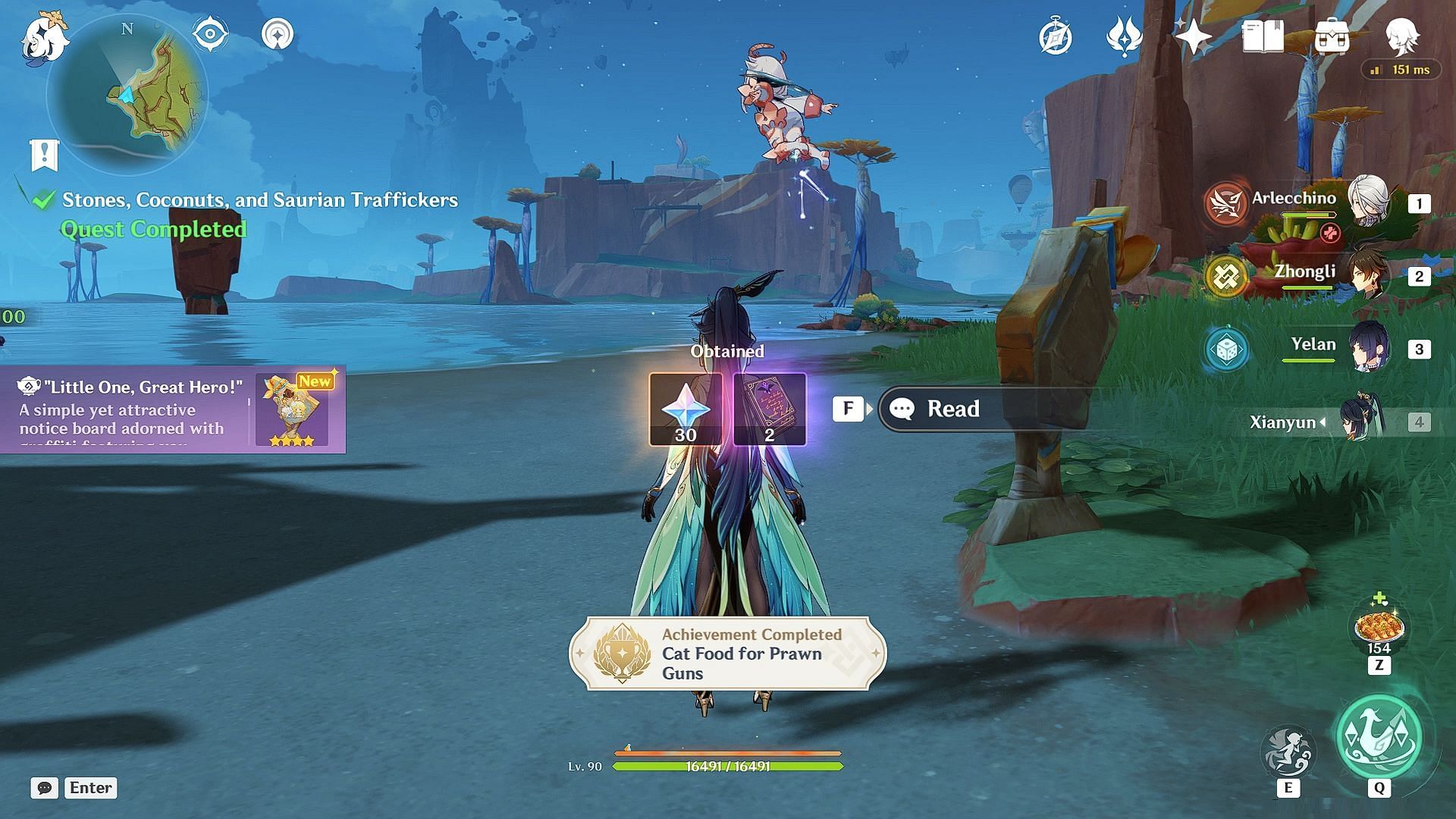 Complete the Stones, Coconuts, and Saurian Traffickers quest to unlock the Cat Food for Prawn Guns achievement in Genshin Impact.