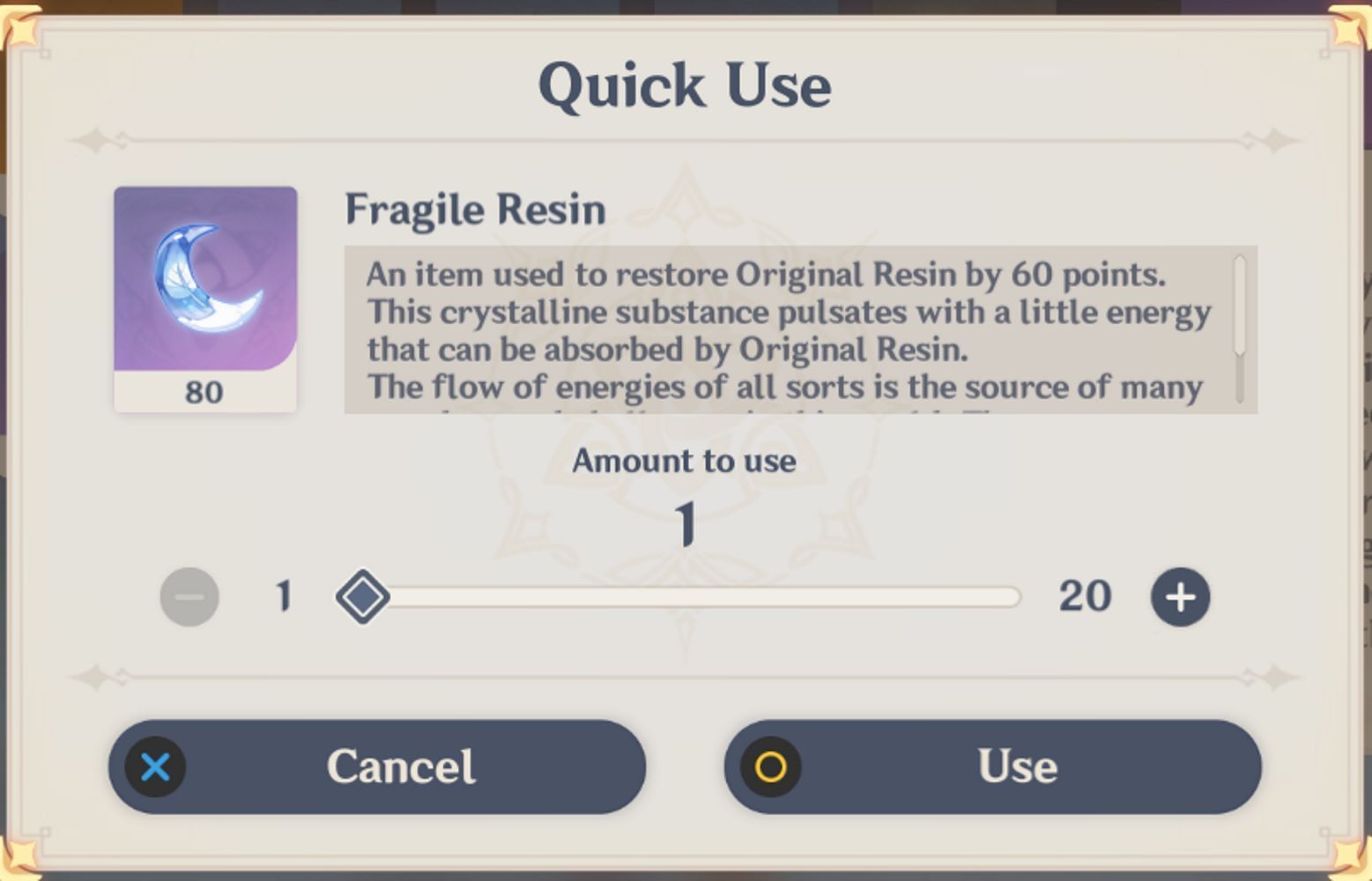 Fragile Resin is located under "Precious Items" in the player's inventory. Click on "Use" to see a screen similar to the above photo. Using one Fragile Resin will recover 60 of the player's Original Resin.
