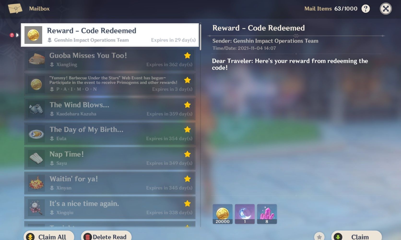 Afterwards, the player should head to their in-game mail to claim it. The mail should read "Reward - Code Redeemed," and it will have:
