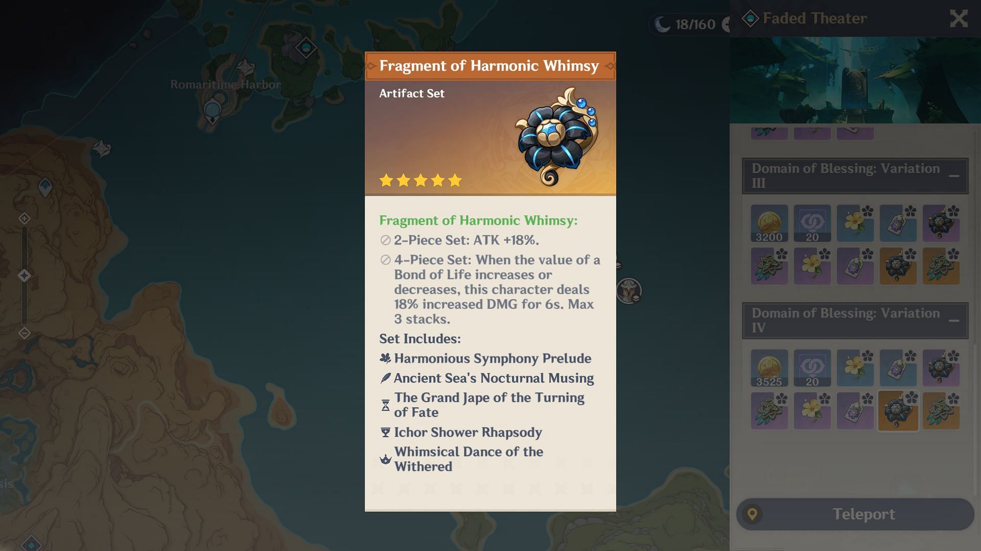 Fragment of Harmonic Whimsy is Clorinde's best artifact set in Genshin Impact. The 2-pc set bonus increases the user's ATK by 18%. Furthermore, the 4-pc bonus increases the user's damage dealt by 54% at max stacks when their Bond of Life value is increased or decreased.