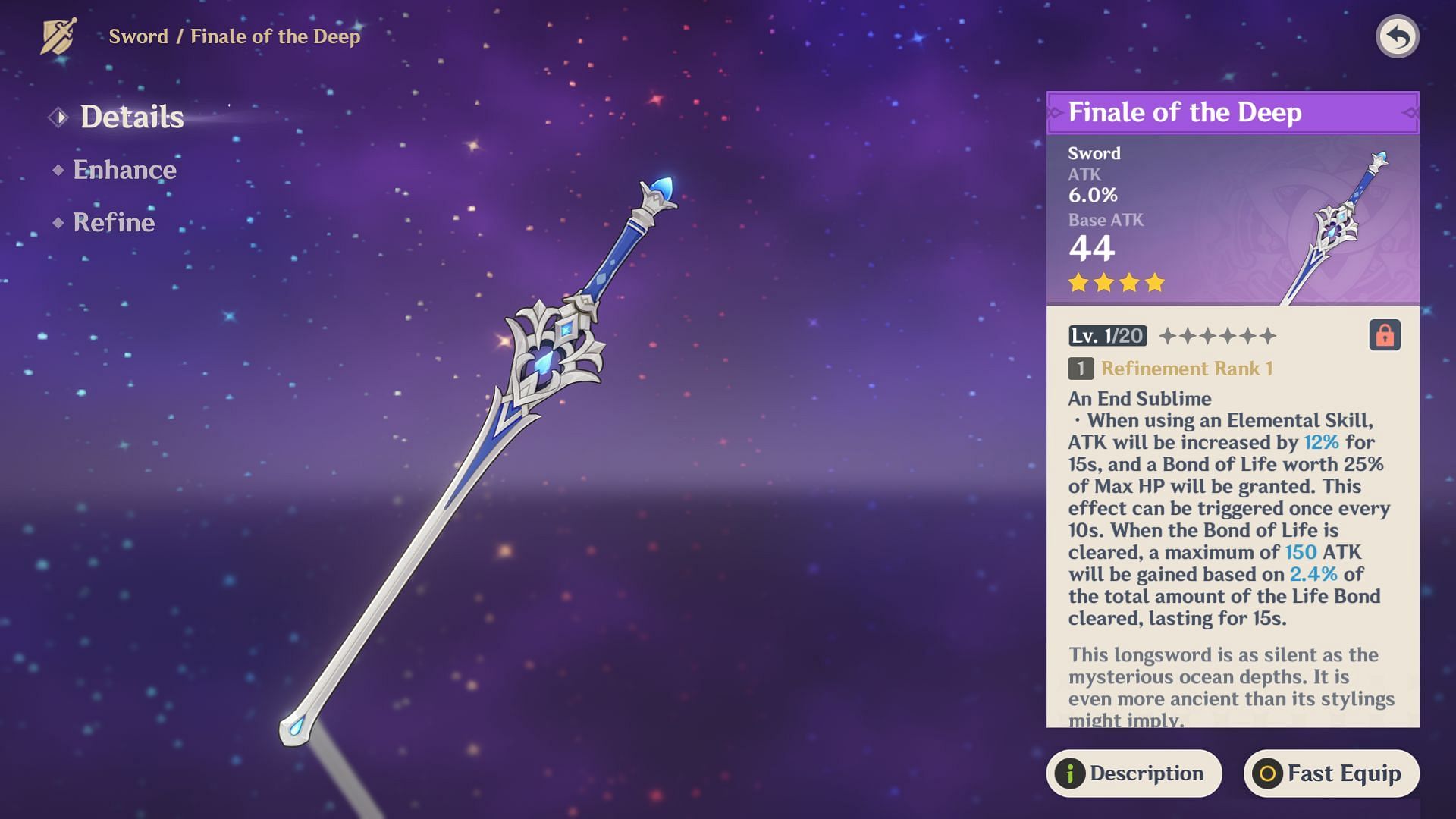 The Finale of the Deep is a craftable weapon and the best F2P option for Clorinde. It provides a lot of ATK% from its second stat and passive. Furthermore, it is worth noting that this is the only Sword in the game that provides a Bond of Life to its user, which works nicely with Clorinde.