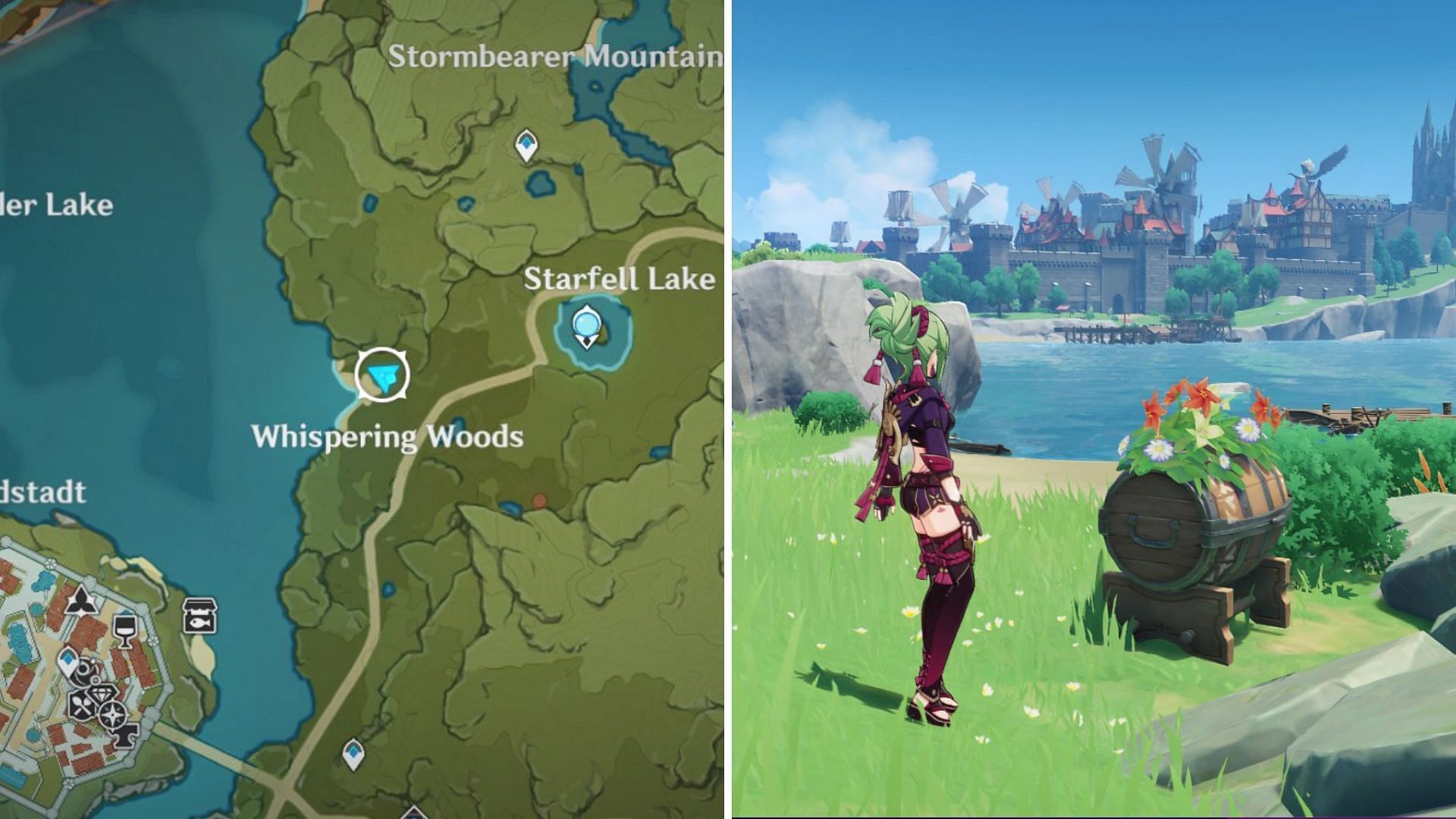 Teleport to the Knights of Favonius waypoint and head southeast towards the location shown in the picture above. Players must climb the windmill to find the third hamper at the top.