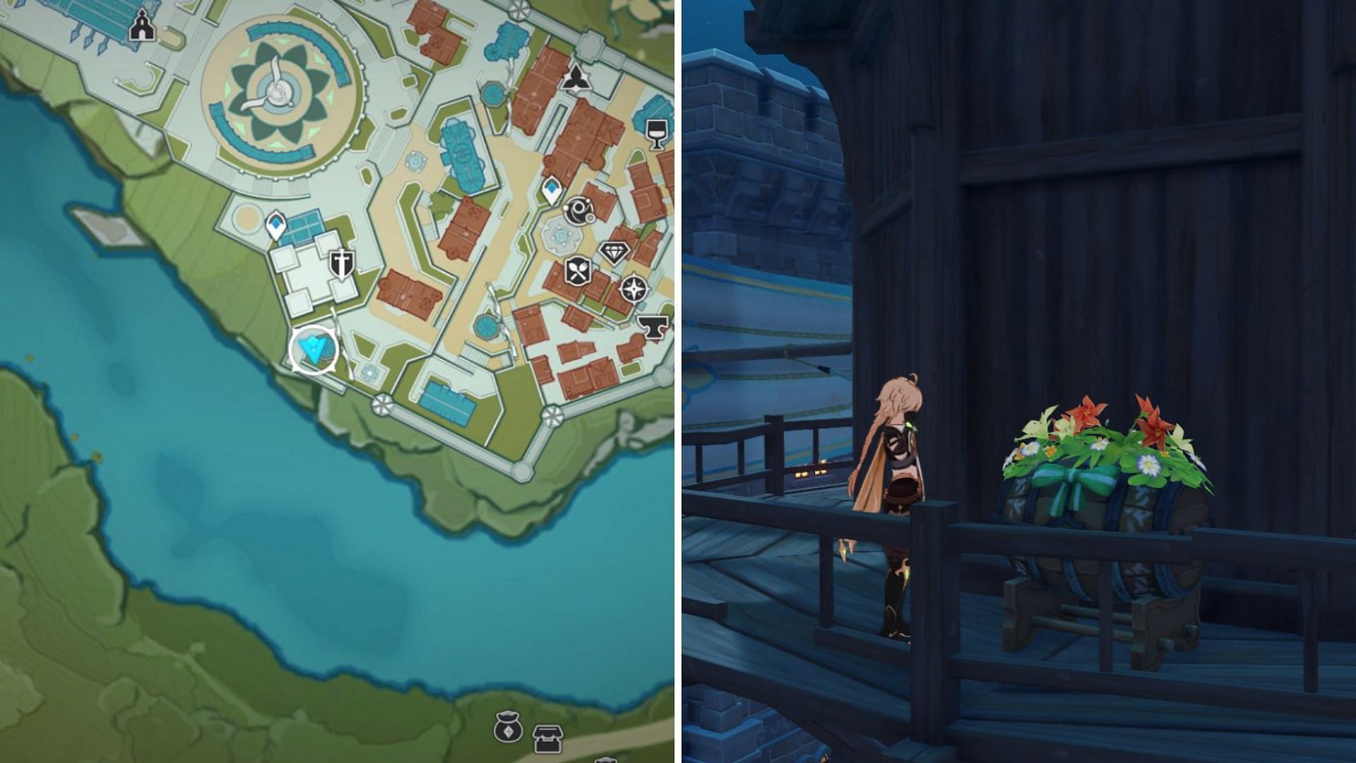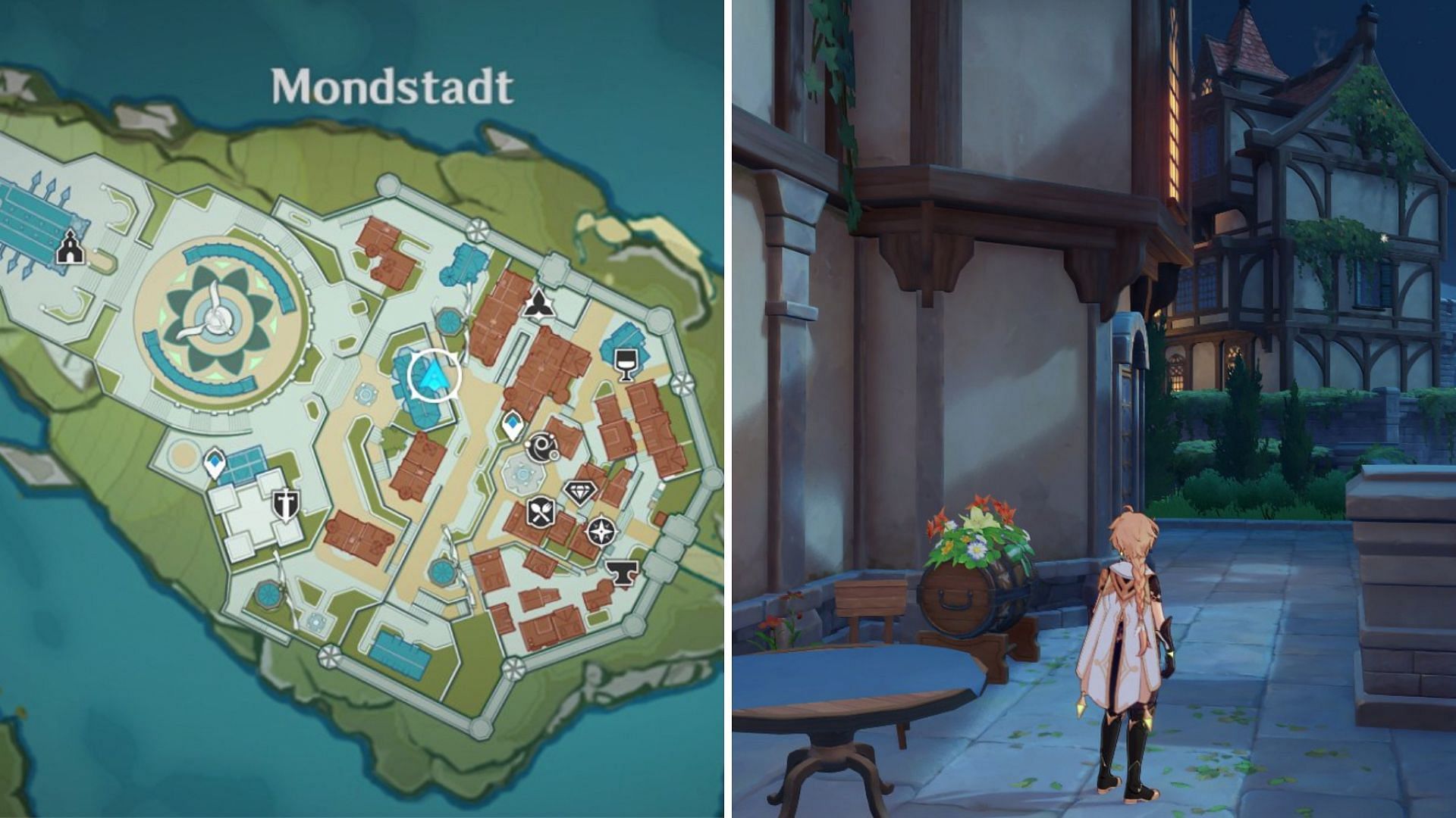 The first hamper can be found behind Marjorie's souvenir shop in Mondstadt City, as shown in the picture above. Go to Marjorie to find a small gap between the buildings and enter the gap to find the gift.