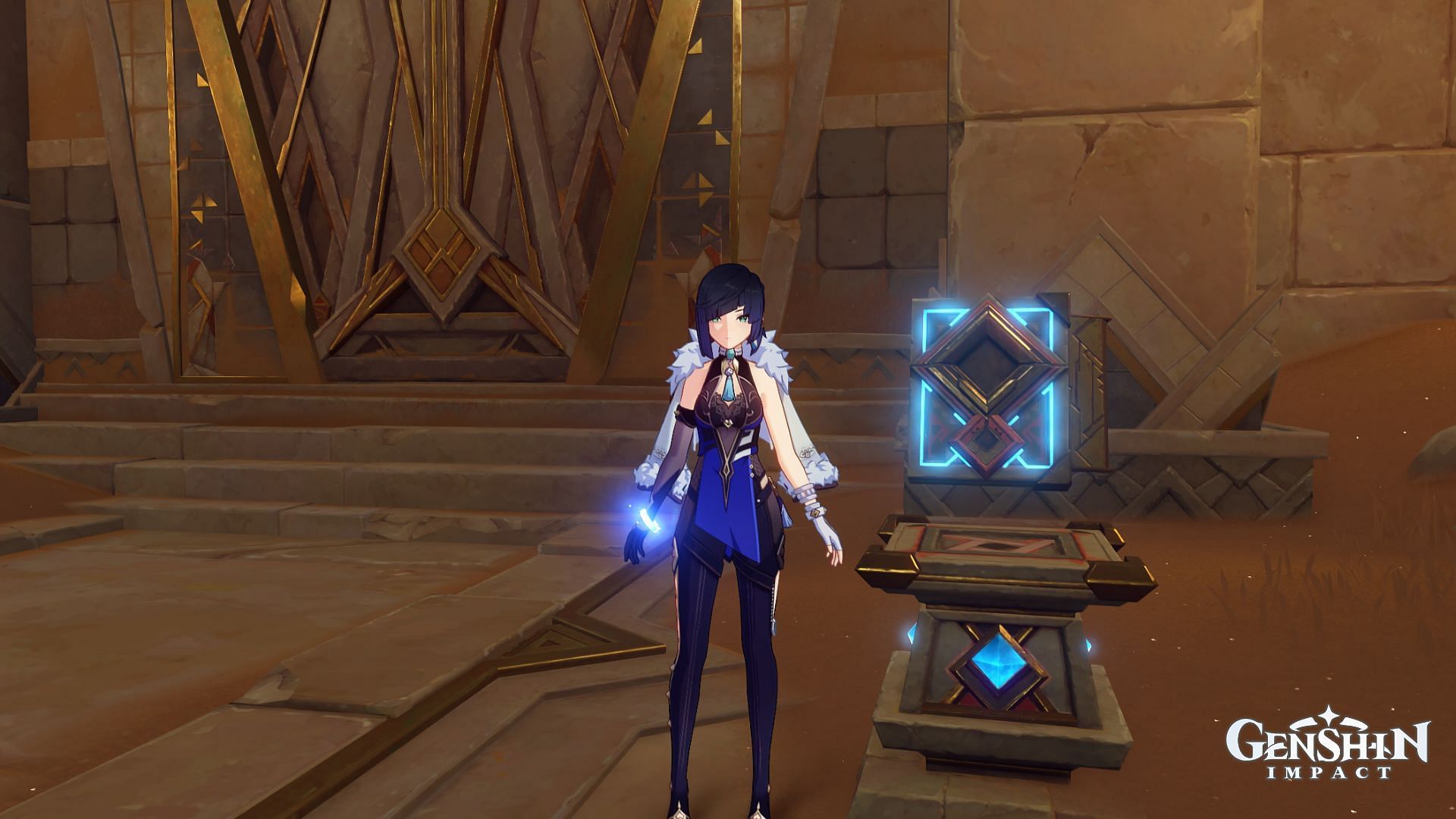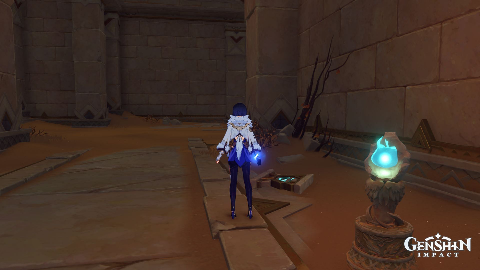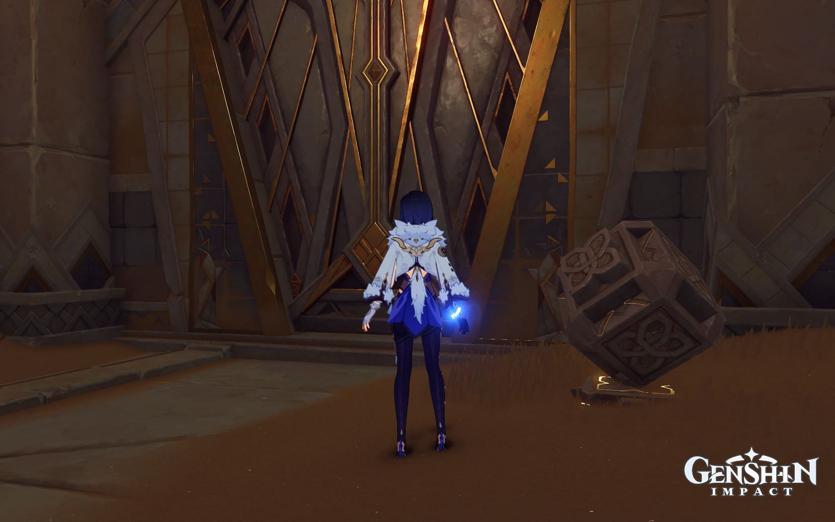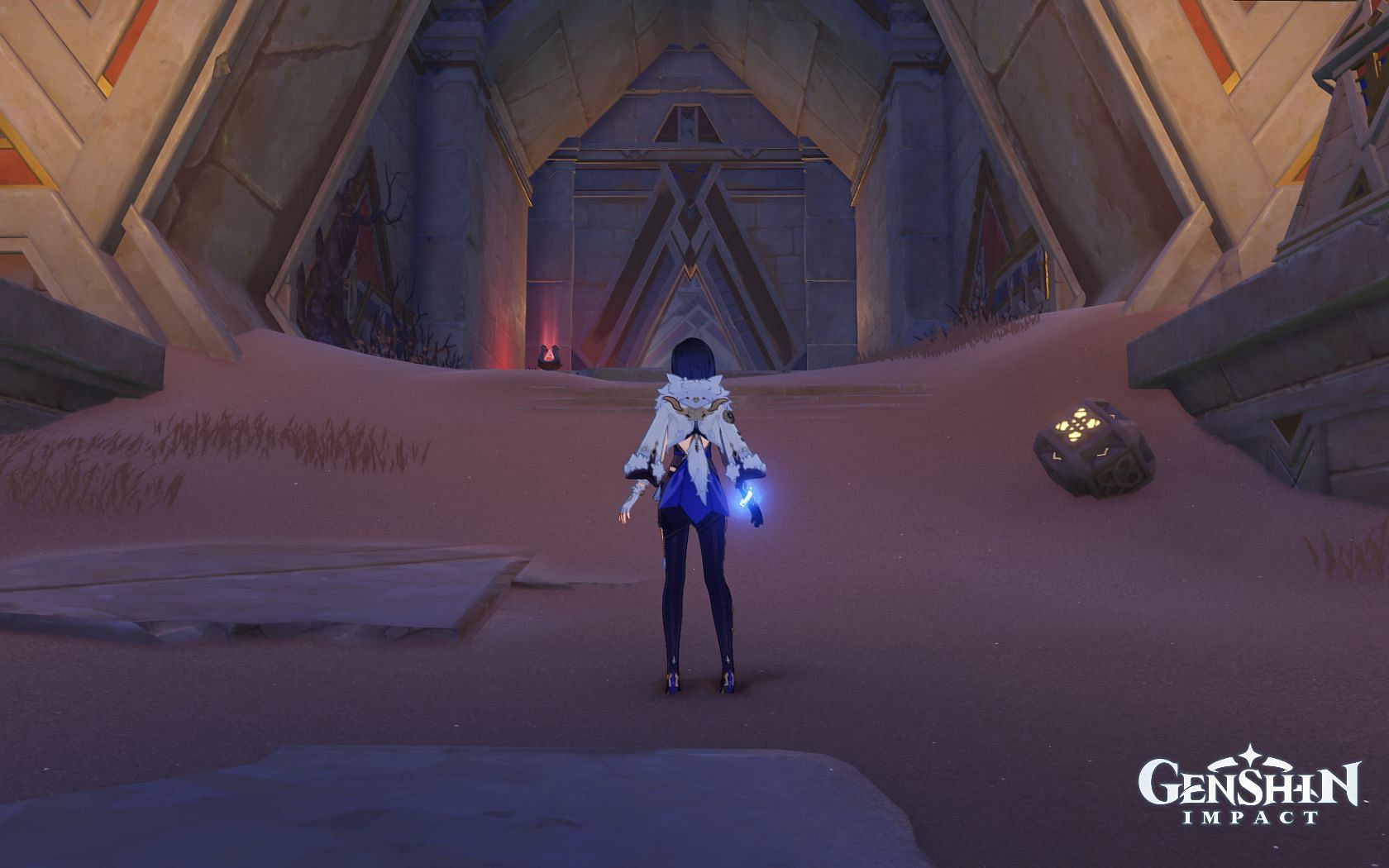 At this location, you will see a cube in some sand. Simply use any Anemo attack to disperse the sand. Once that's done, activate the cube to see the door in front of you open.