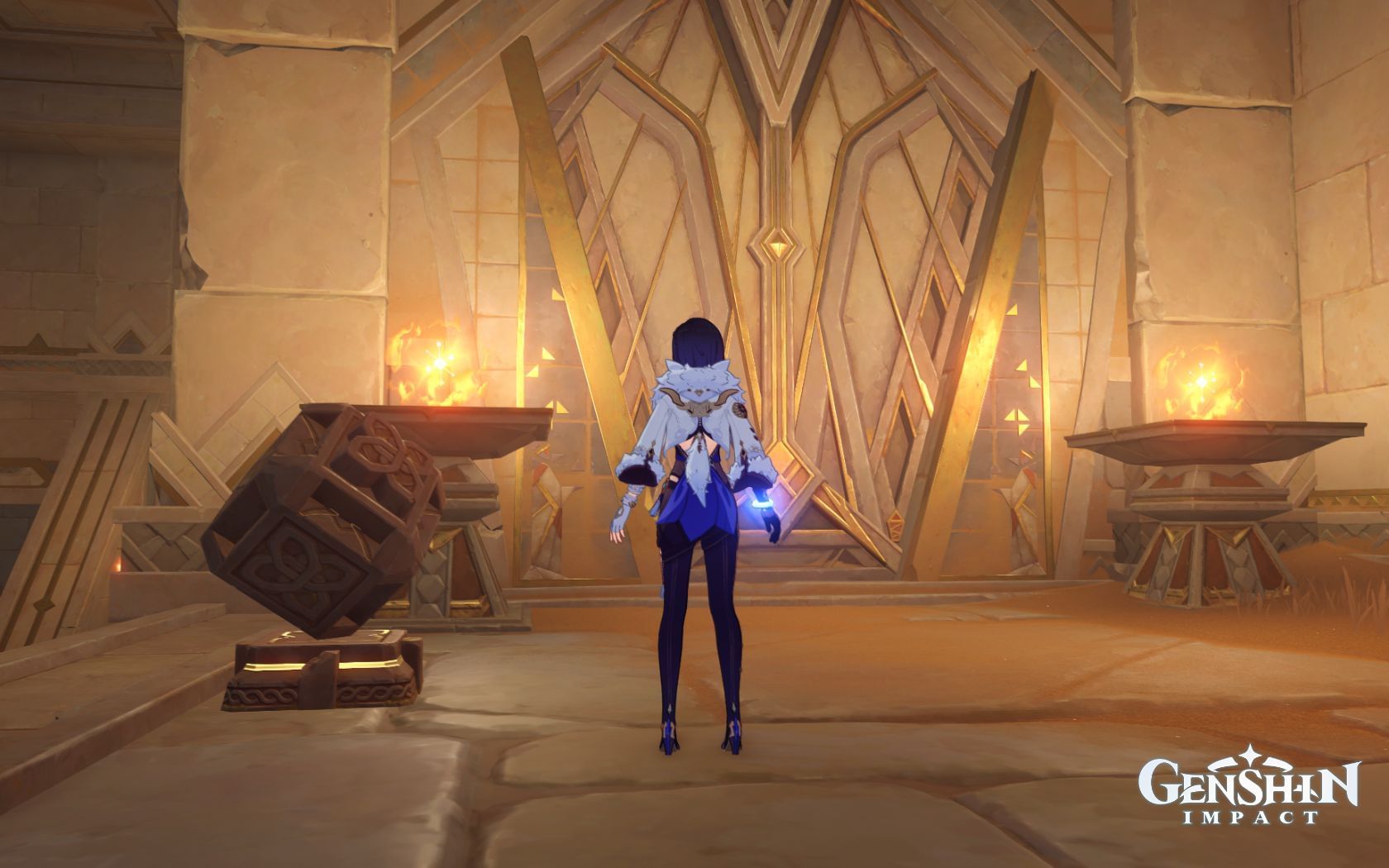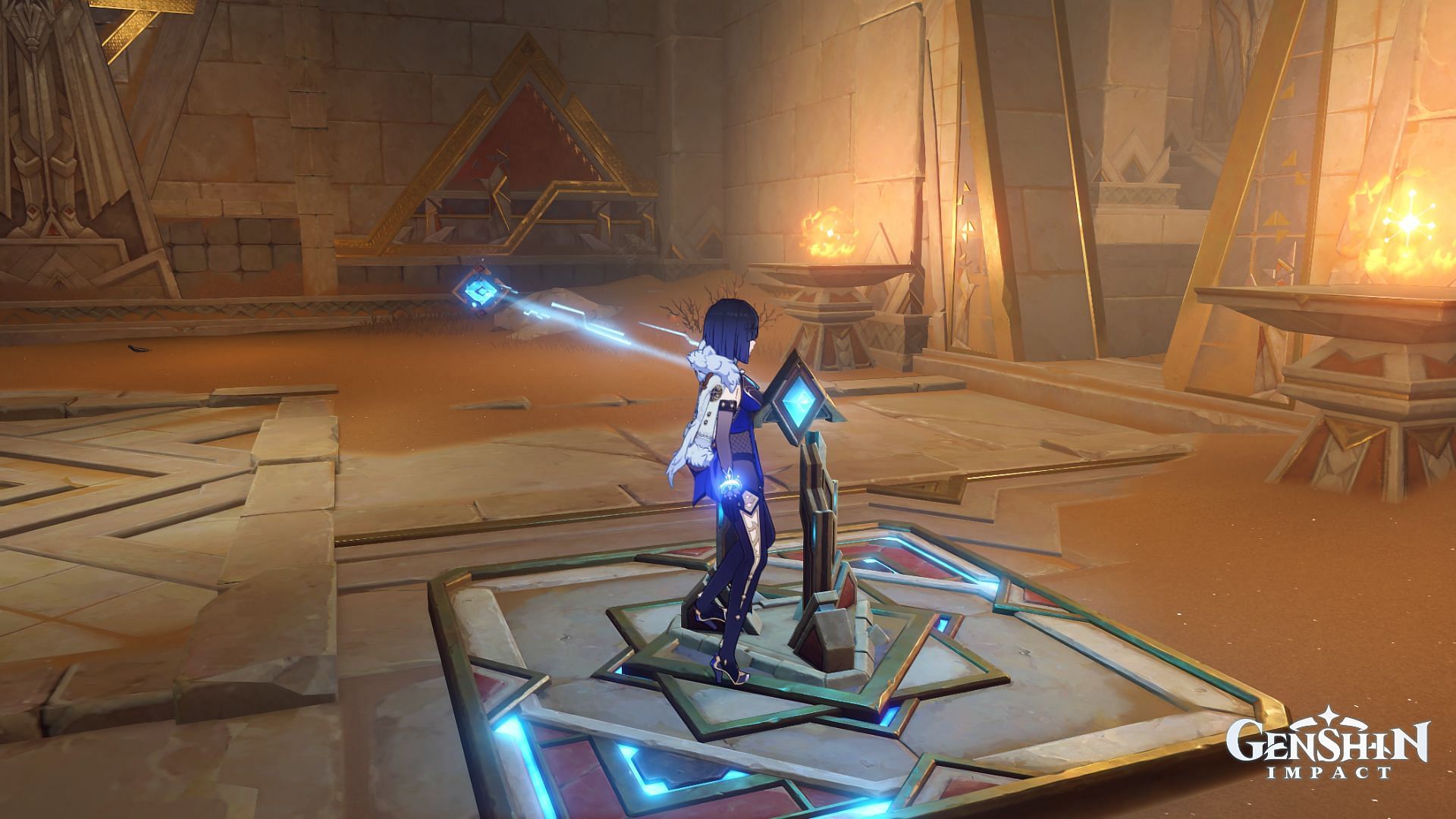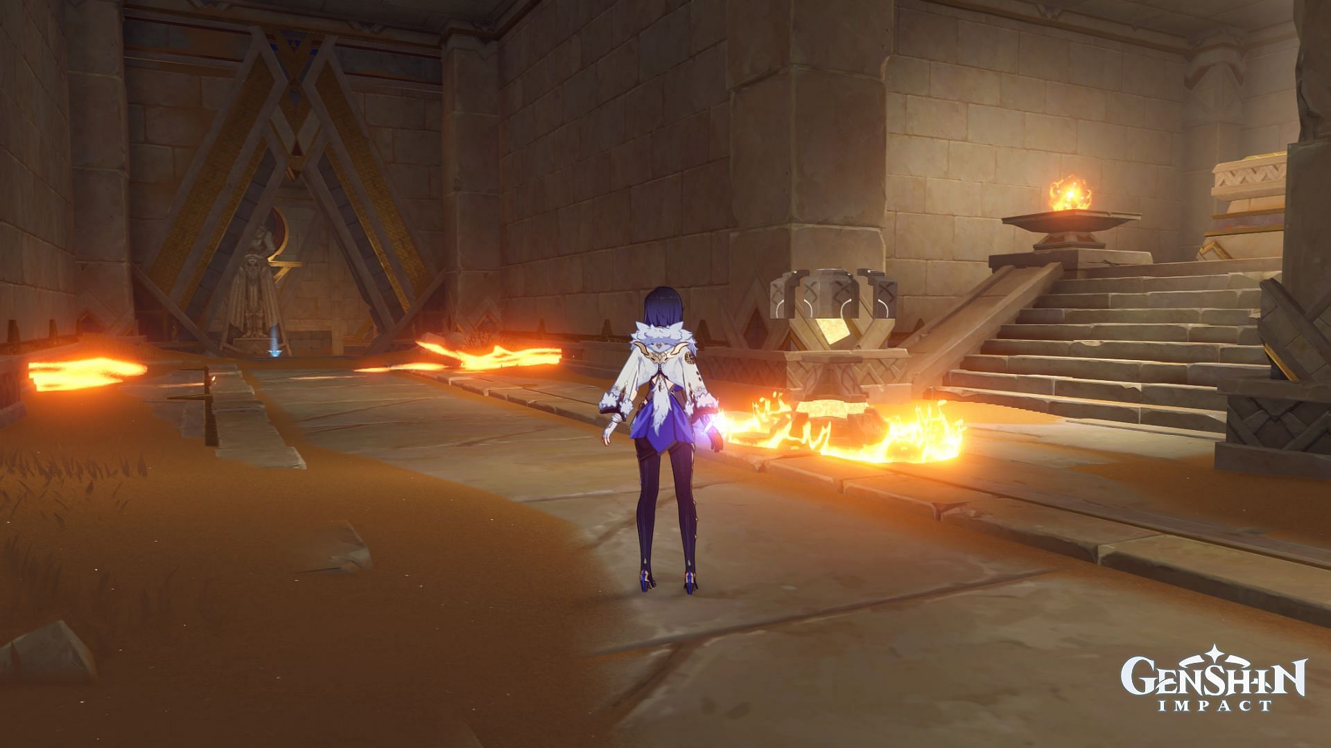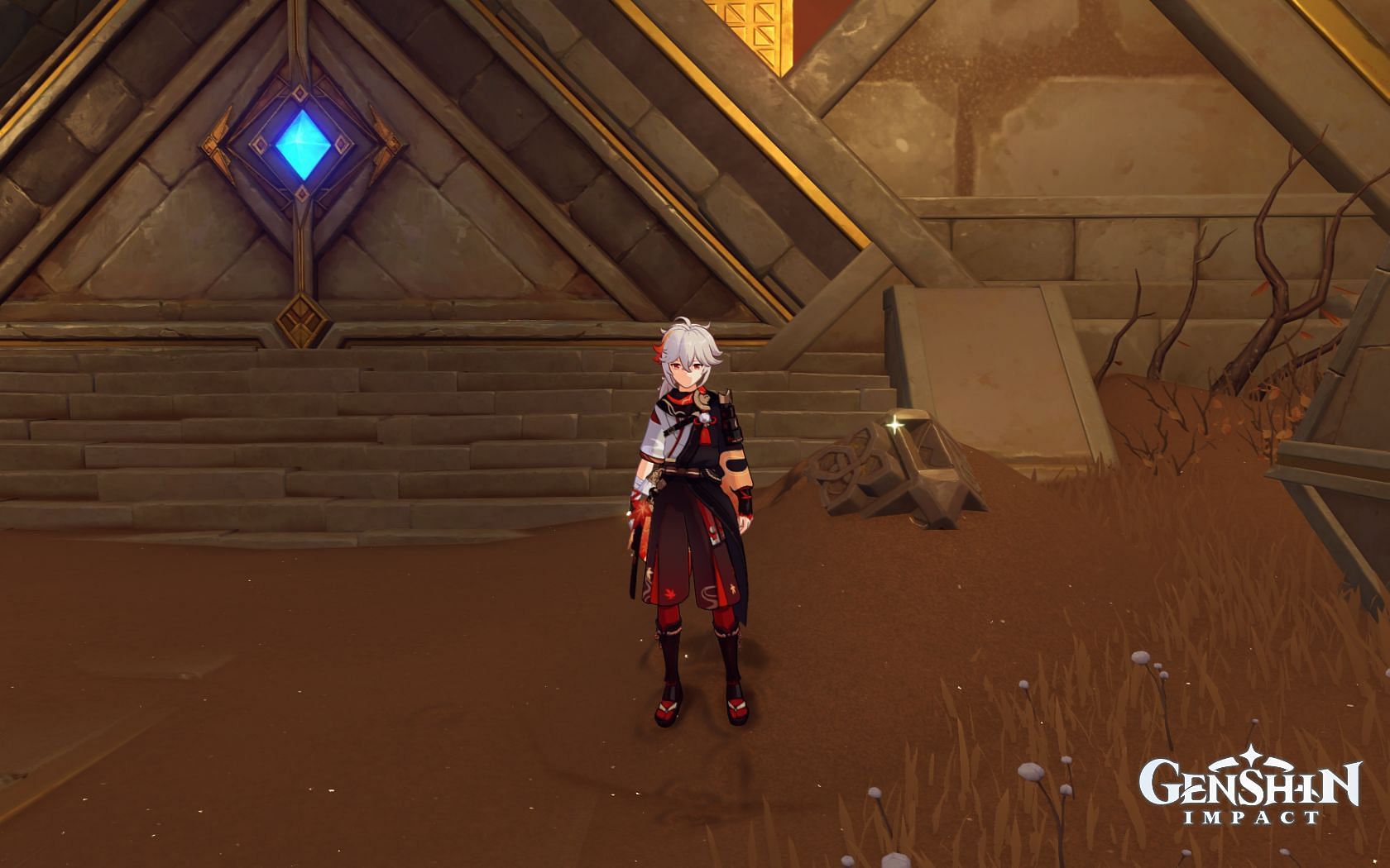 At this location, you will see a cube in some sand. Simply use any Anemo attack to disperse the sand. Once that's done, activate the cube to see the door in front of you open.